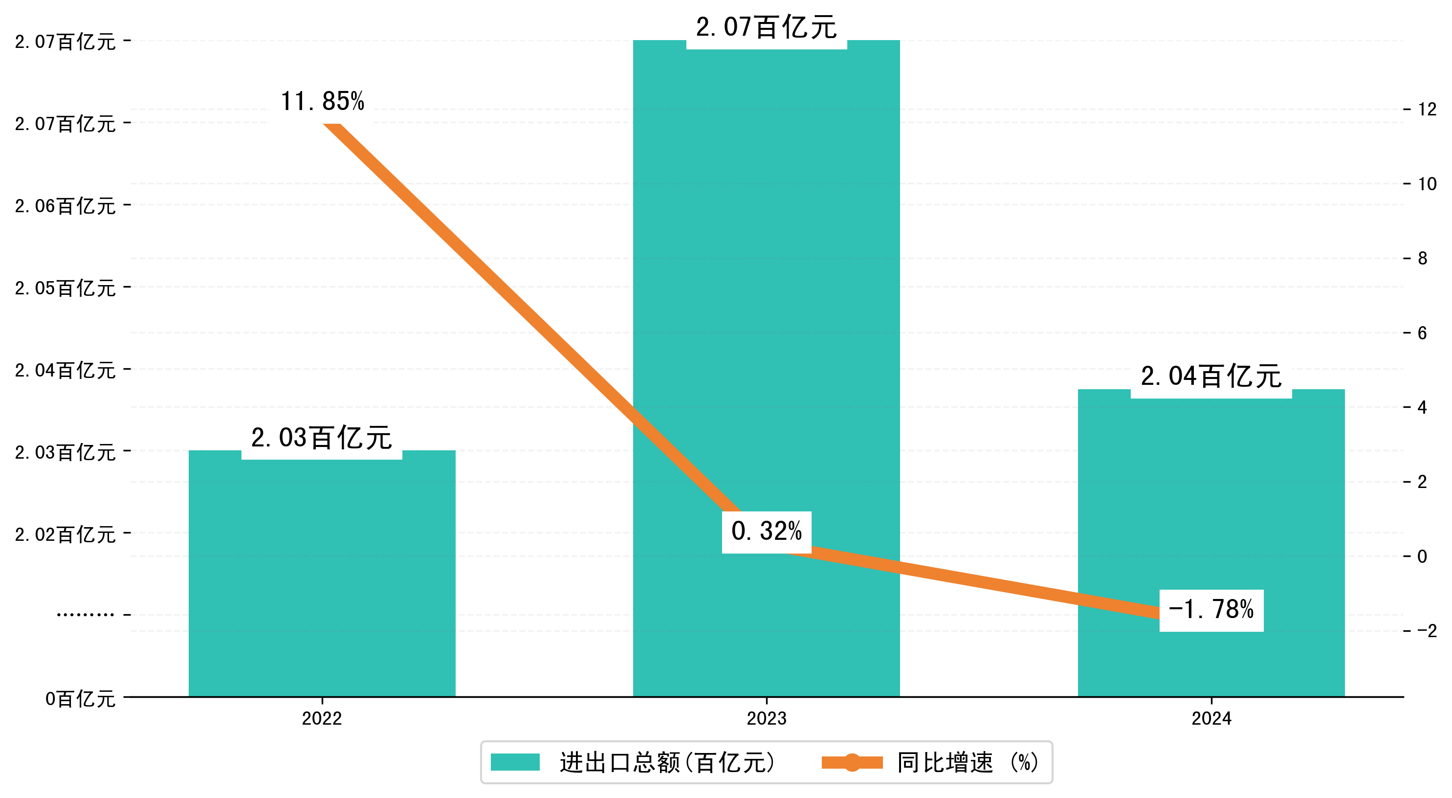 以人民币计,2024年1-6月秦皇岛市进出口总额为203,7445.4262万元,相比上年同期减少了3,6861.4782万元,同比减少了-1.20%。