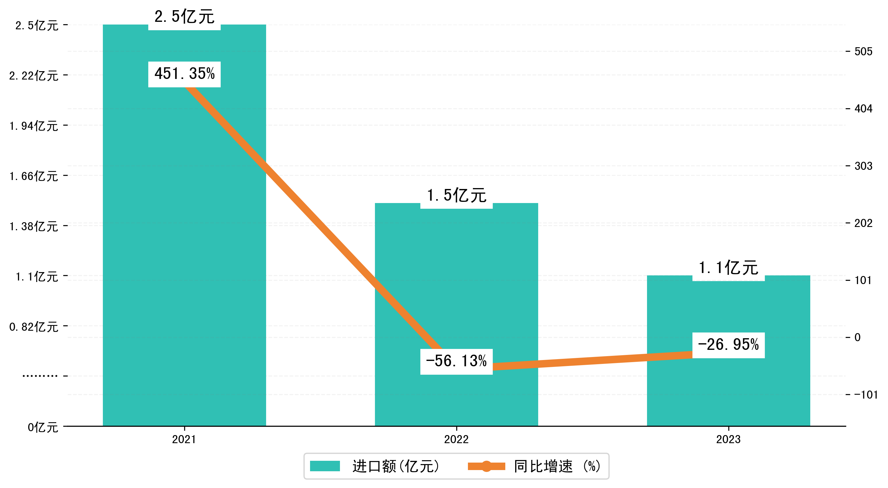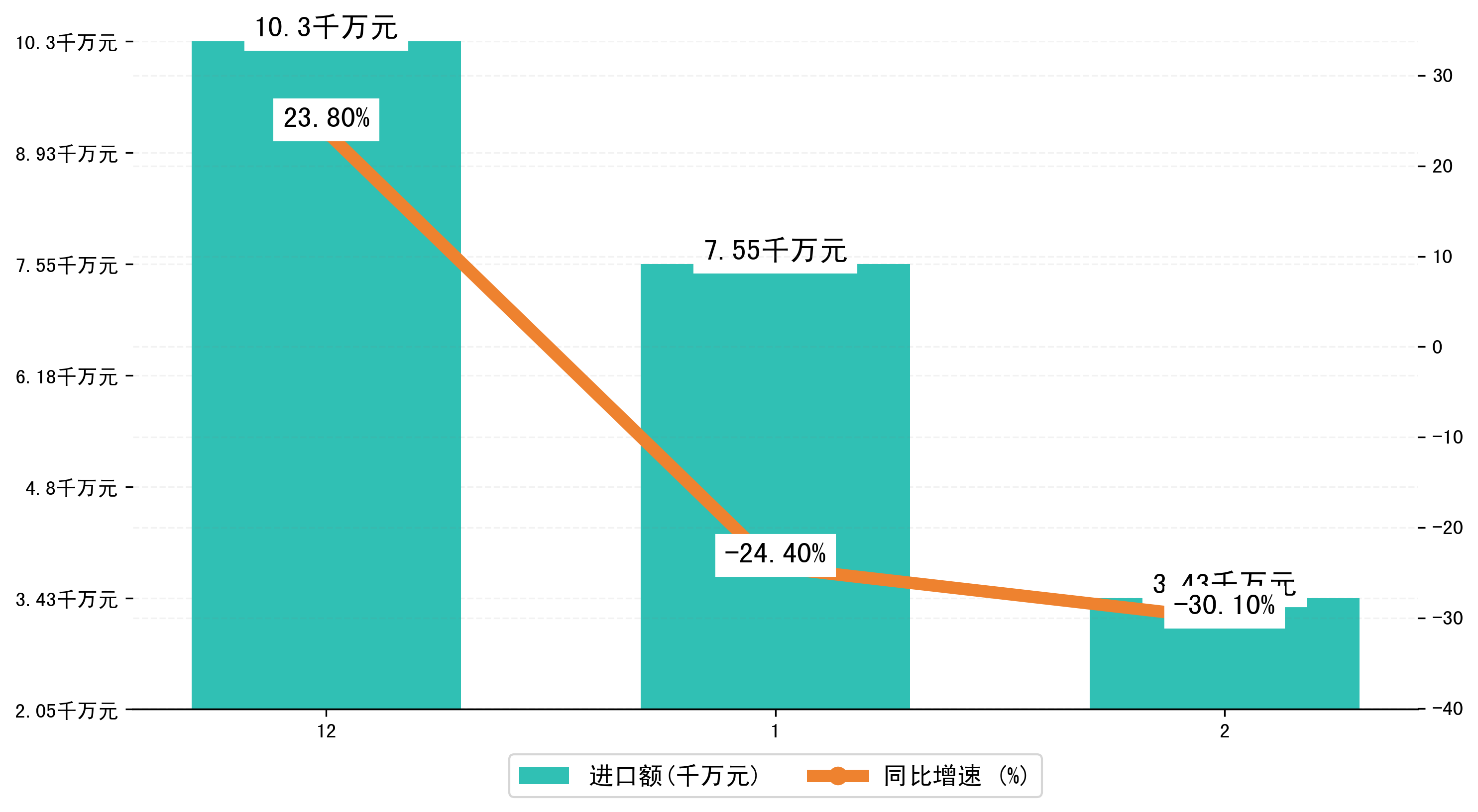 以人民币计,2023年2月曲靖市进口额为3425.9701万元,相比上月减少了4123.4322万元;相比上年同期减少了2229.0278万元,同比减少了-30.10%。