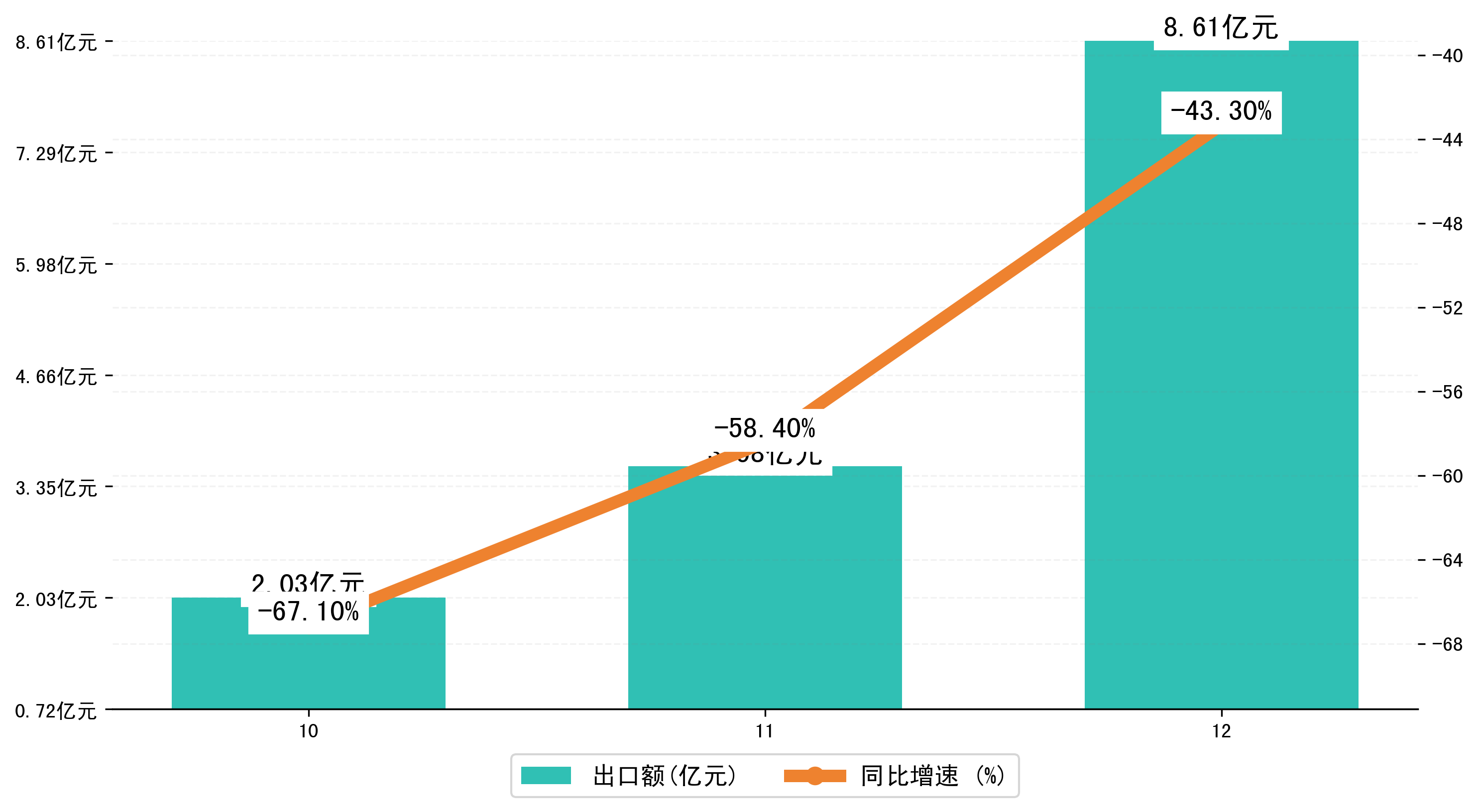 以人民币计,2023年12月曲靖市出口额为8,6071.5965万元,相比上月增加了5,0237.4533万元;相比上年同期增加了2,3953.0183万元,同比减少了-43.30%。