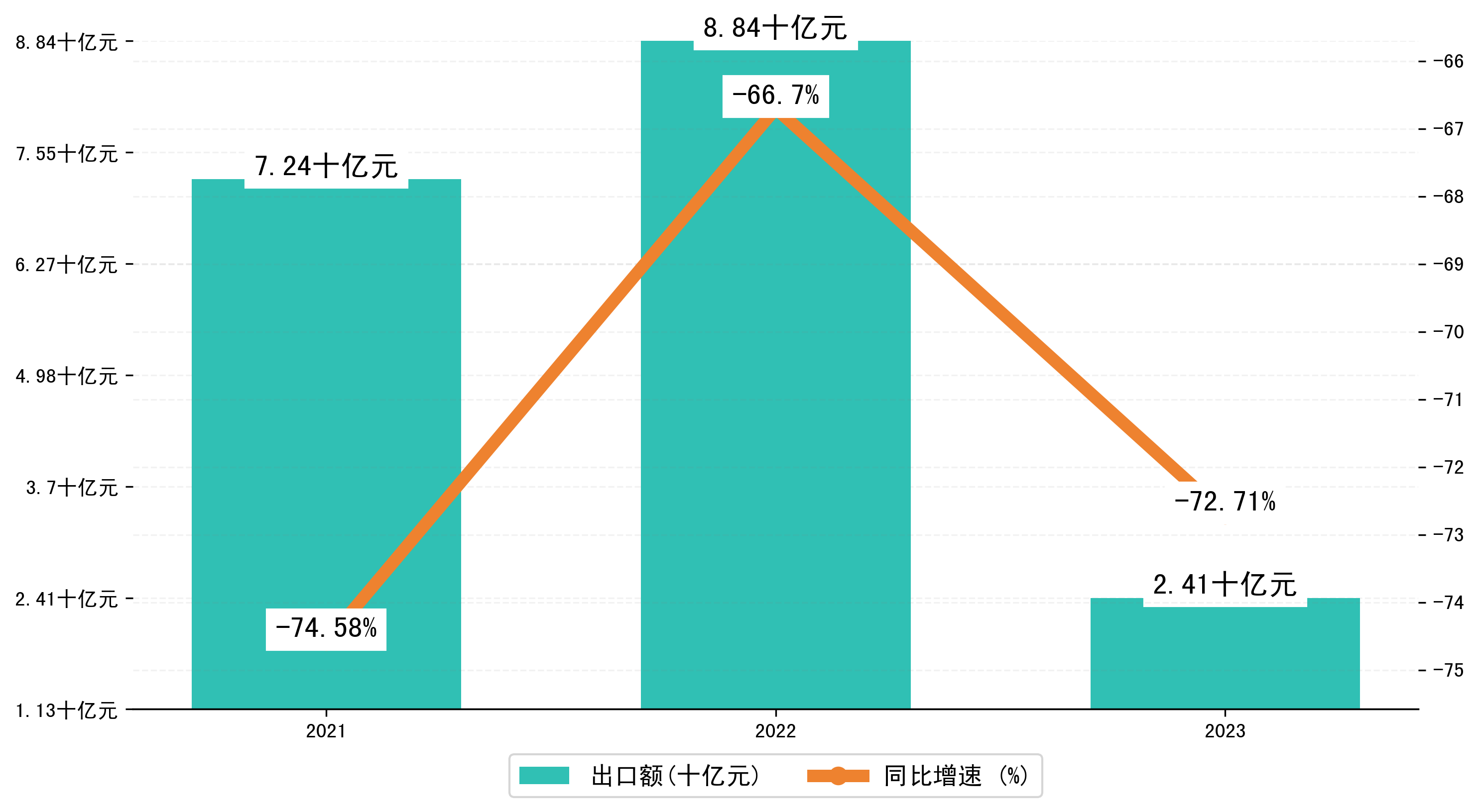 以美元计,2023年1-12月曲靖市出口额为3,4009.9639万美元,相比上年同期减少了9,6874.1625万美元,同比减少-46.10%。