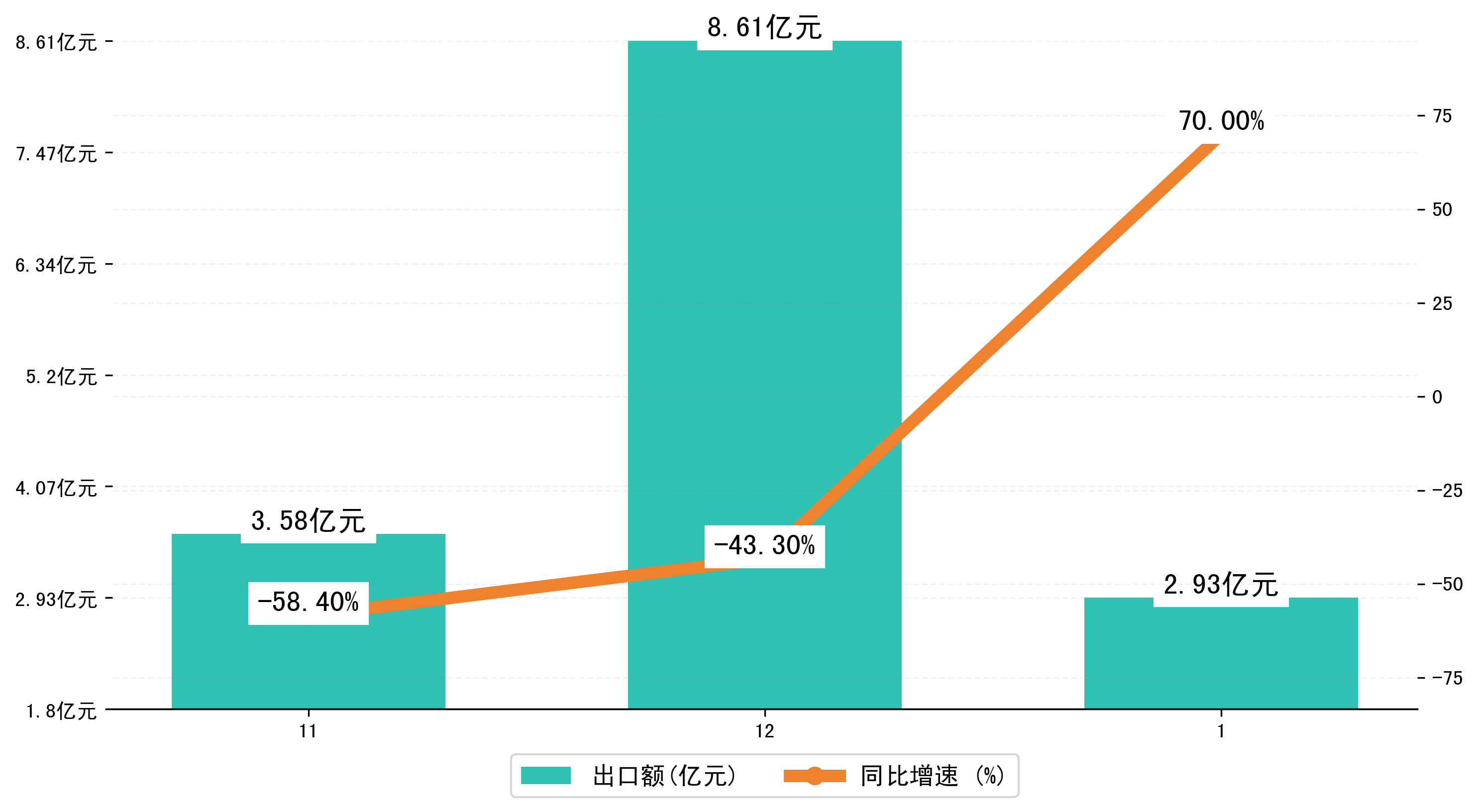 以美元计,2024年1-1月曲靖市出口额为4116.154万美元,相比上年同期减少了131.9755万美元,同比增加67.00%。