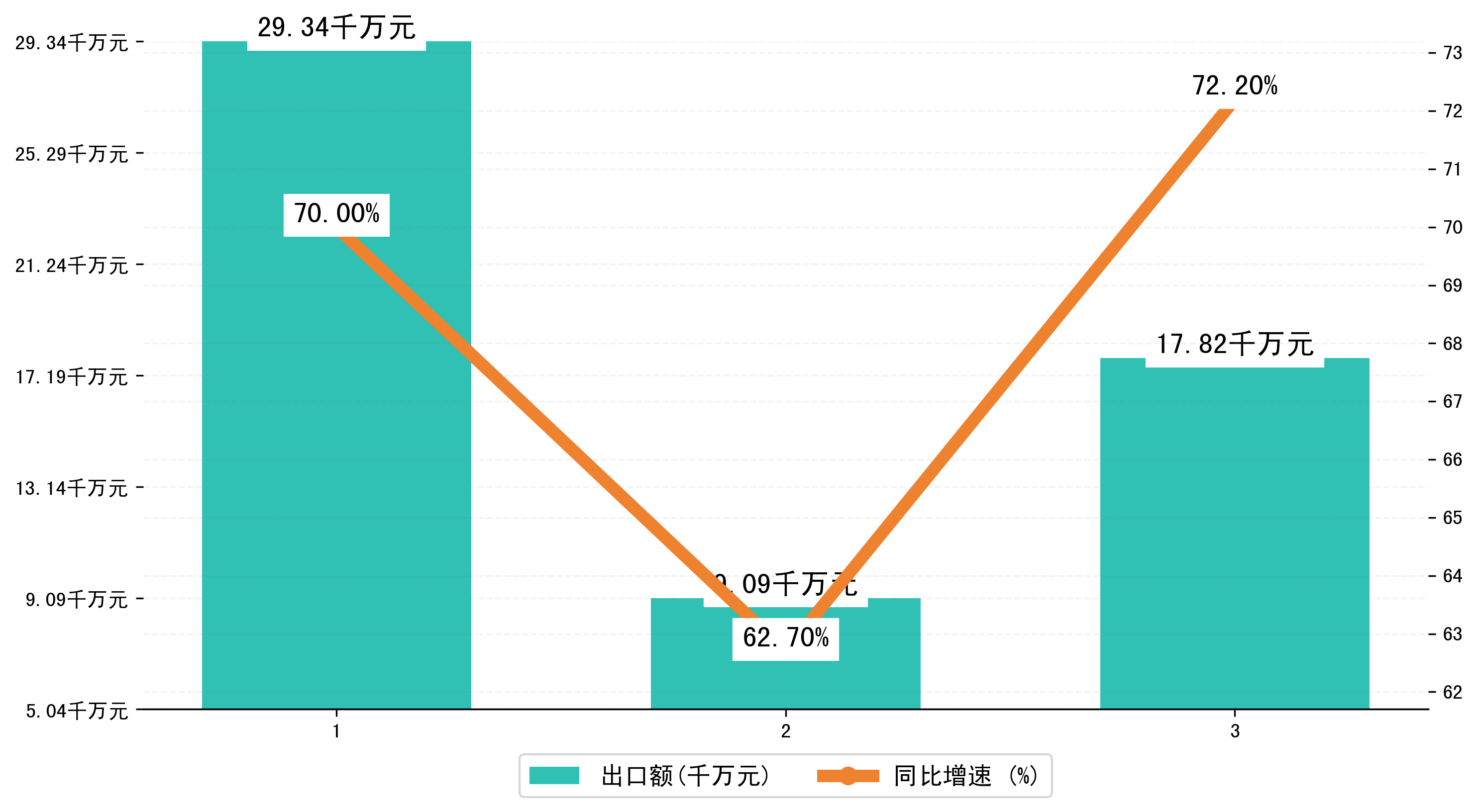 以人民币计,2024年3月曲靖市出口额为1,7818.566万元,相比上月增加了8730.4065万元;相比上年同期增加了8766.7013万元,同比增加了72.20%。