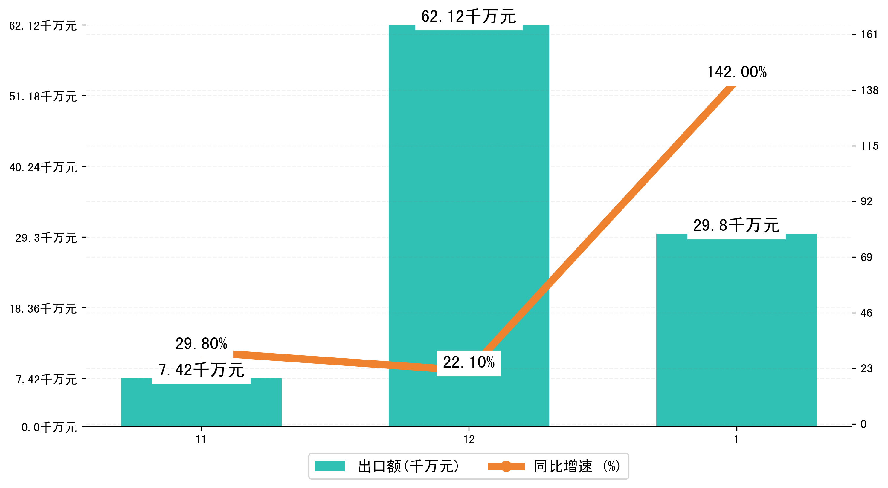 以人民币计,2023年1月曲靖市出口额为2,9800.4359万元,相比上月减少了3,2318.1423万元;相比上年同期增加了1,7485.7796万元,同比增加了142.00%。