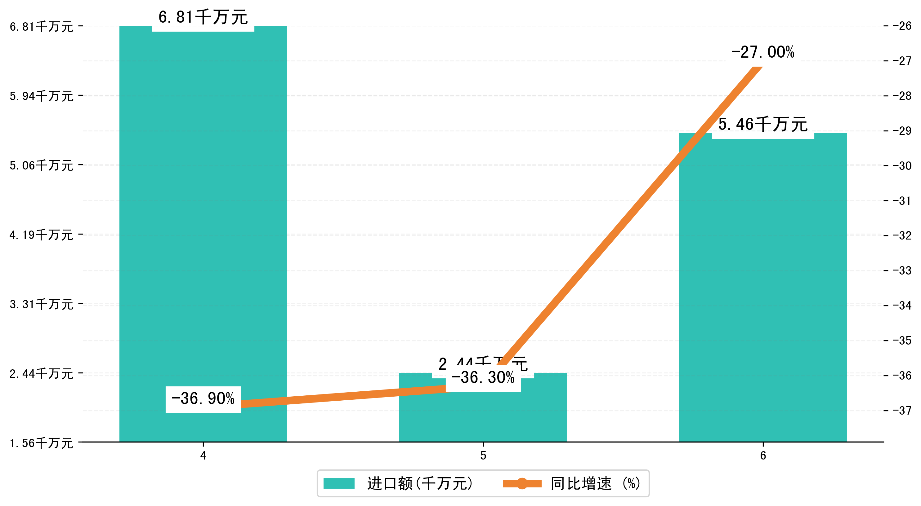 以美元计,2023年1-6月曲靖市进口额为4450.3655万美元,相比上年同期减少了2199.4638万美元,同比减少-32.50%。