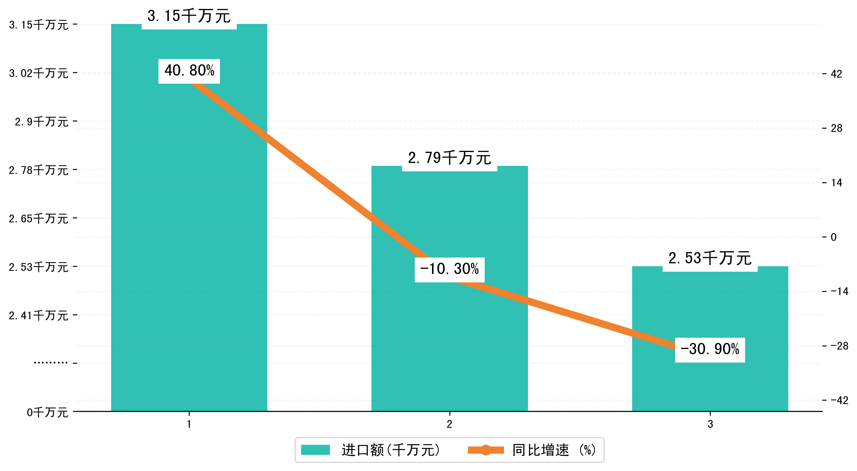 以人民币计,2025年1-3月曲靖市进口额为8463.0309万元,相比上年同期减少了3913.1024万元,同比减少了-30.90%。