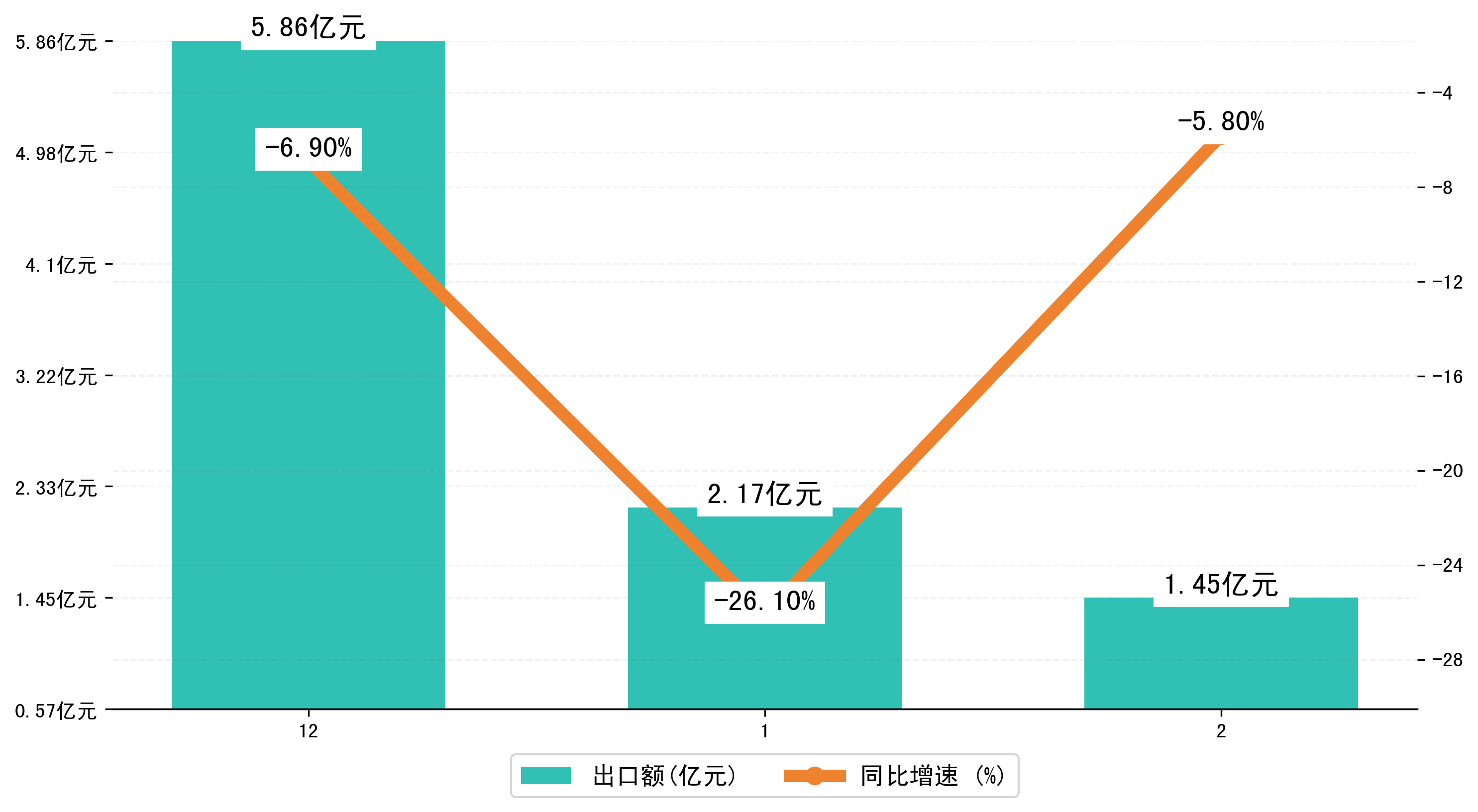 以美元计,2025年1-2月曲靖市进出口总额为5861.1519万美元,相比上年同期减少了481.1792万美元,同比减少-7.30%。