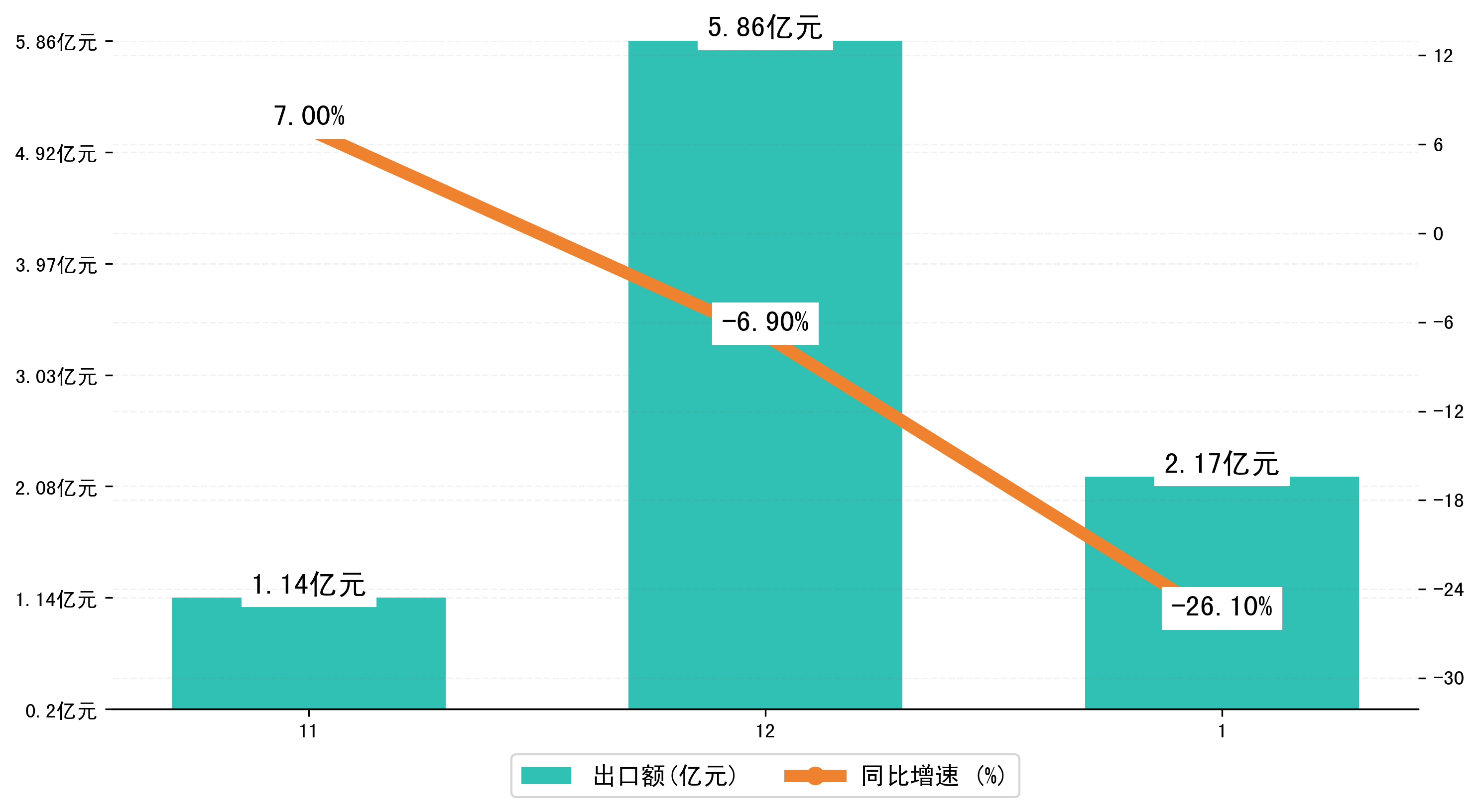 以美元计,2025年1-1月曲靖市进出口总额为3452.8608万美元,相比上年同期减少了980.7407万美元,同比减少-22.10%。
