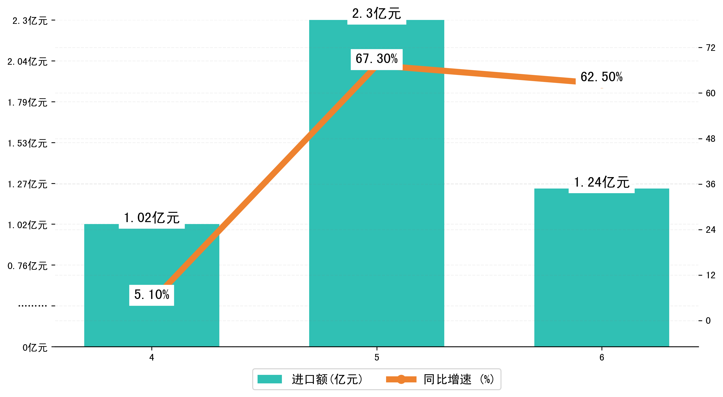 以人民币计,2025年6月曲靖市进口额为1,2415.2898万元,相比上月减少了1,0544.1854万元;相比上年同期增加了4073.1298万元,同比增加了62.50%。