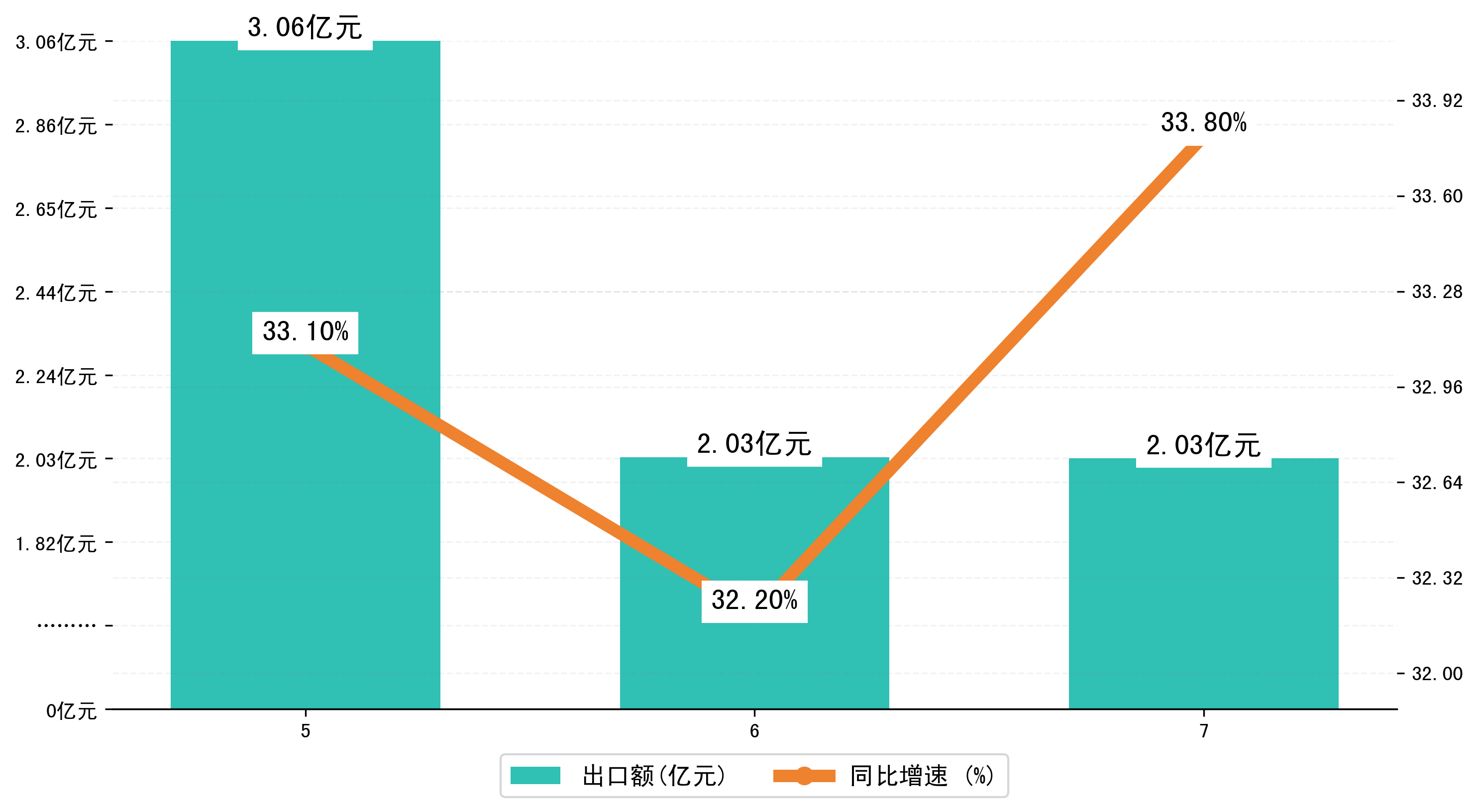 以美元计,2025年1-7月曲靖市出口额为2,0374.9689万美元,相比上年同期增加了4993.4954万美元,同比增加32.50%。