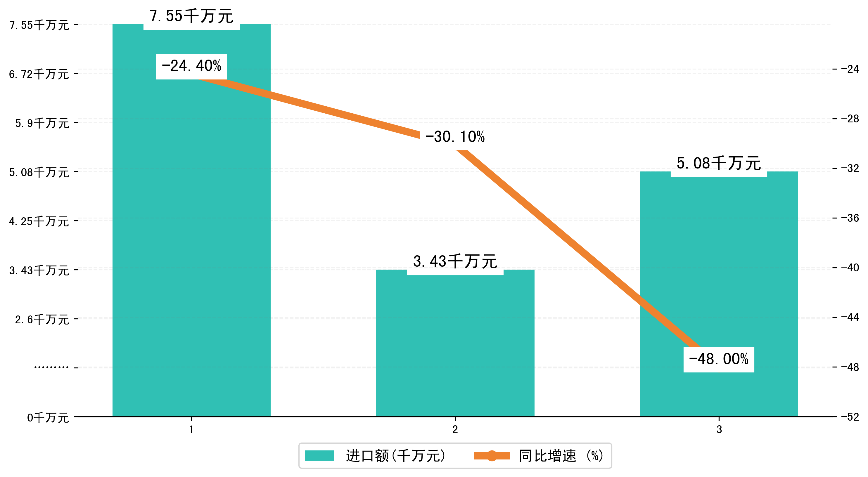 以人民币计,2023年3月曲靖市进口额为5075.4216万元,相比上月增加了1649.4515万元;相比上年同期减少了1,0521.12万元,同比减少了-48.00%。