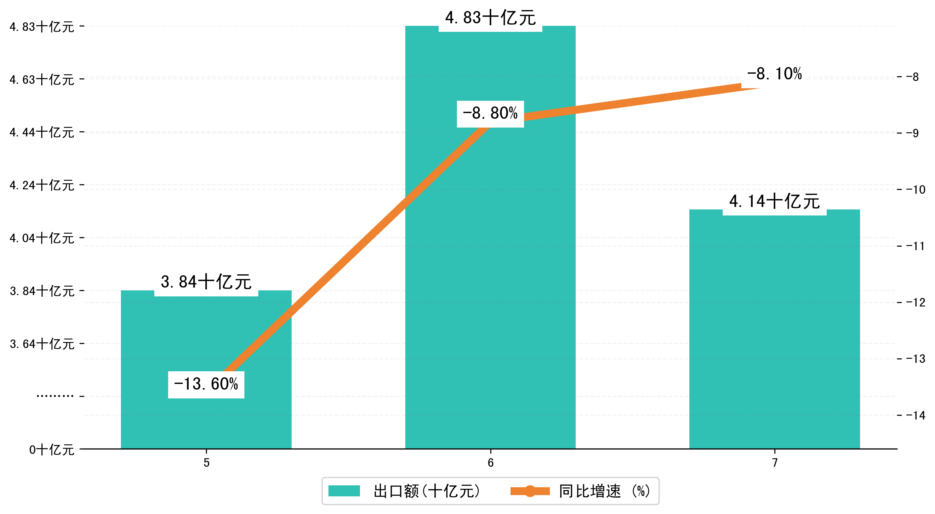 以人民币计,2024年7月日照市出口额为41,4391.9731万元,相比上月减少了6,8757.9092万元;相比上年同期减少了1,8091.2024万元,同比减少了-8.10%。