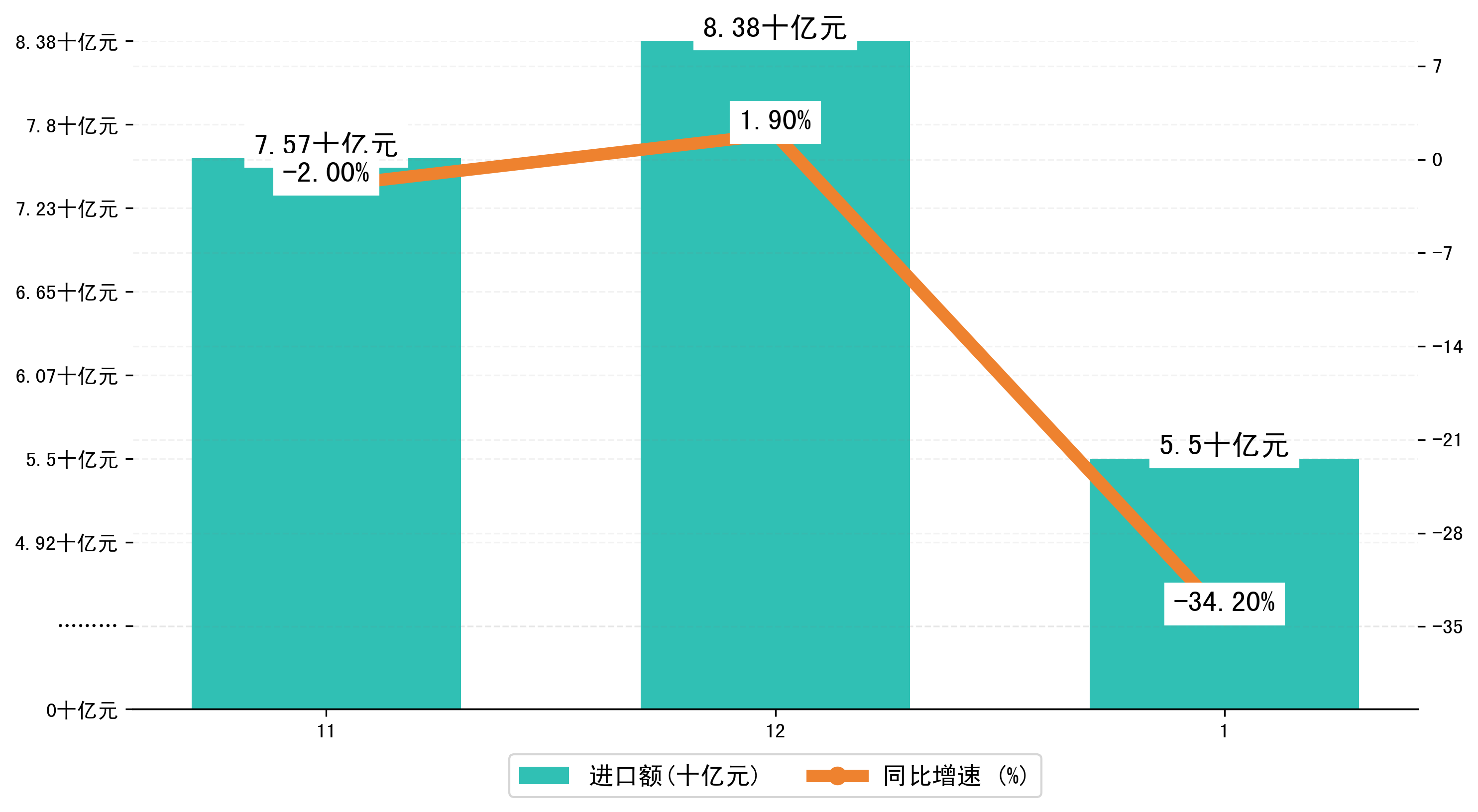 以美元计,2024年1-1月日照市进口额为7,7353.2483万美元,相比上年同期减少了3,8979.9127万美元,同比减少-35.40%。