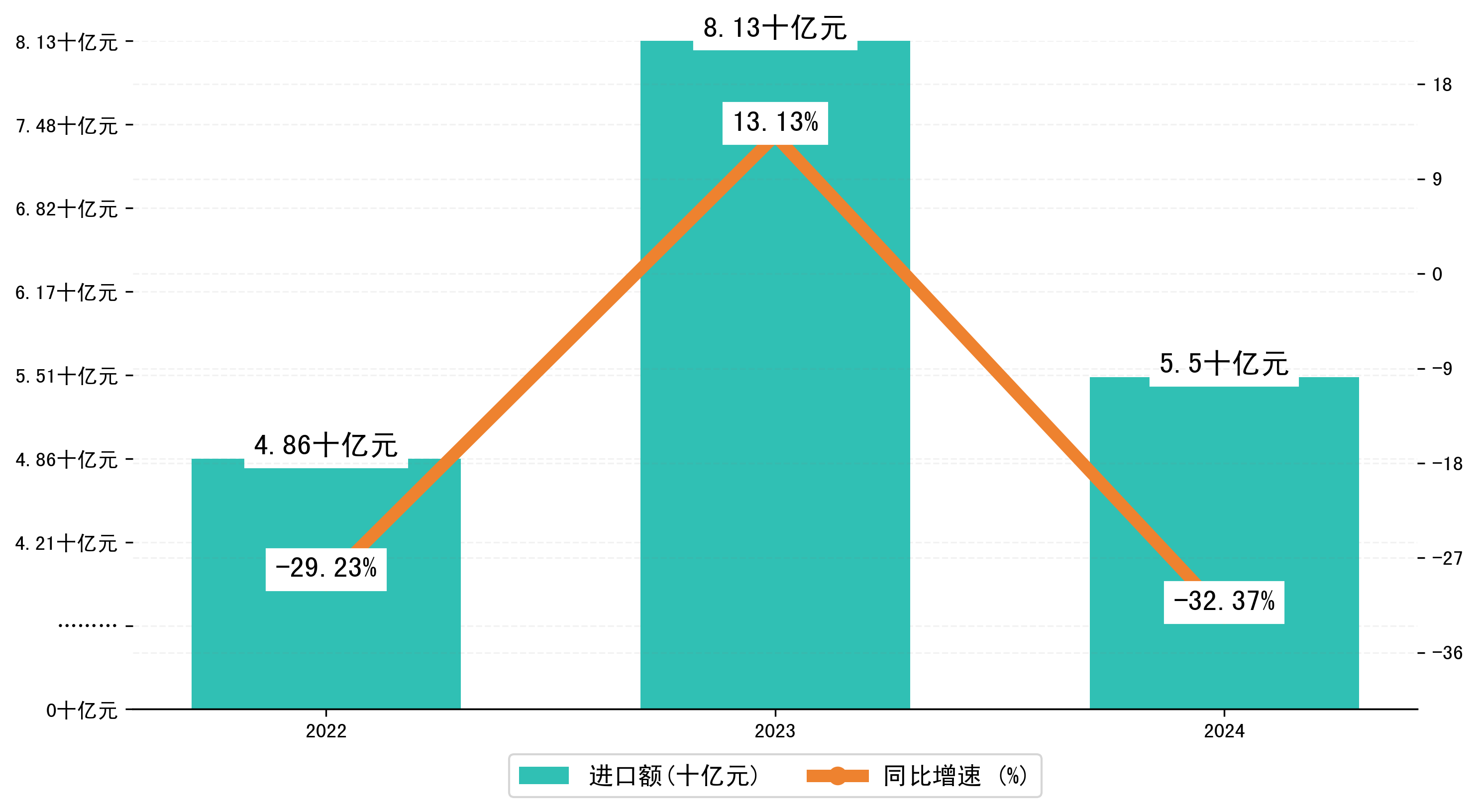 以美元计,2024年1月日照市进口额为7,7353.2483万美元,相比上月减少了3,9613.5681万美元;相比上年同期减少了3,8979.9127万美元,同比减少-35.40%。