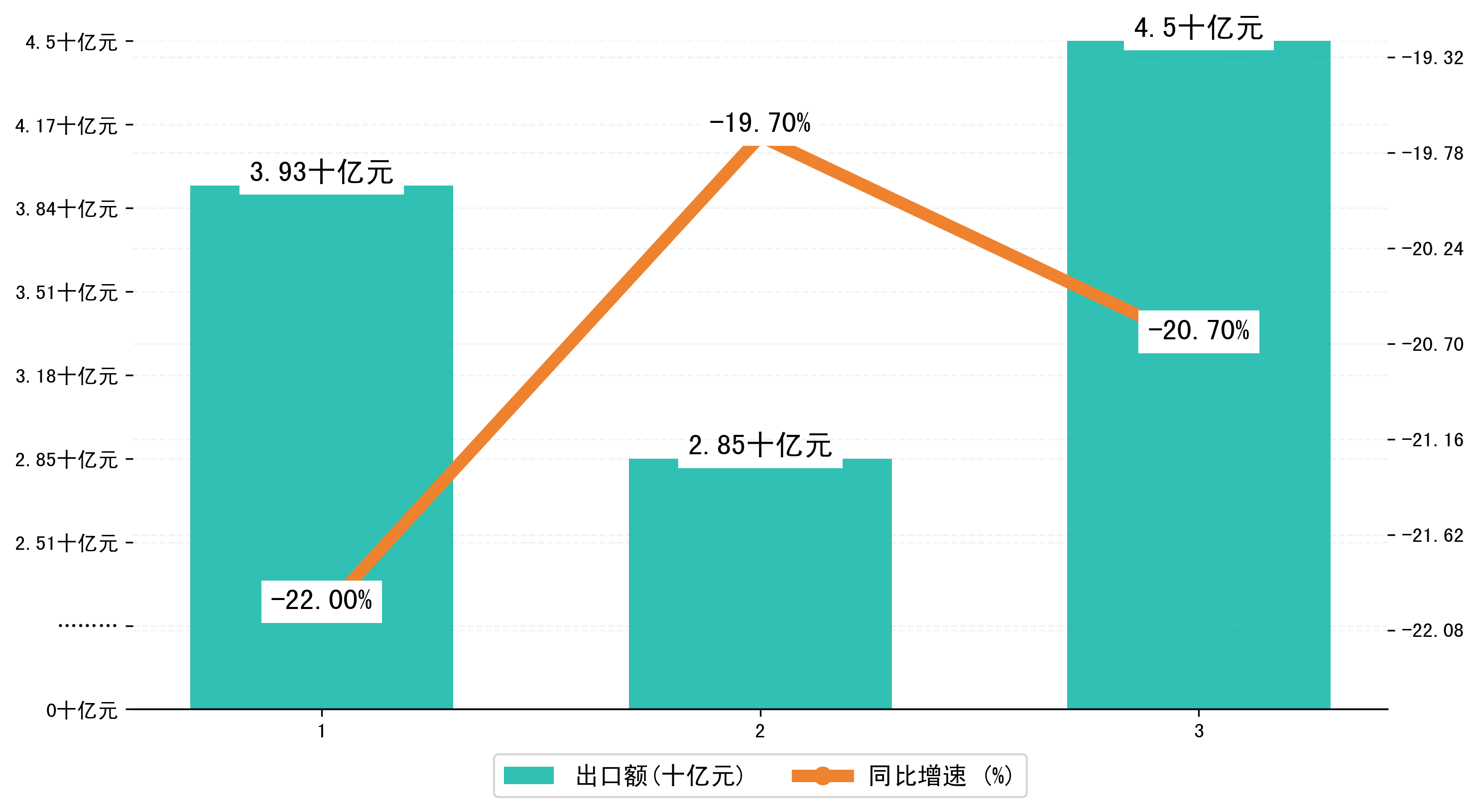 以人民币计,2024年3月日照市出口额为44,9692.3508万元,相比上月增加了16,5173.8176万元;相比上年同期减少了13,8585.7363万元,同比减少了-20.70%。