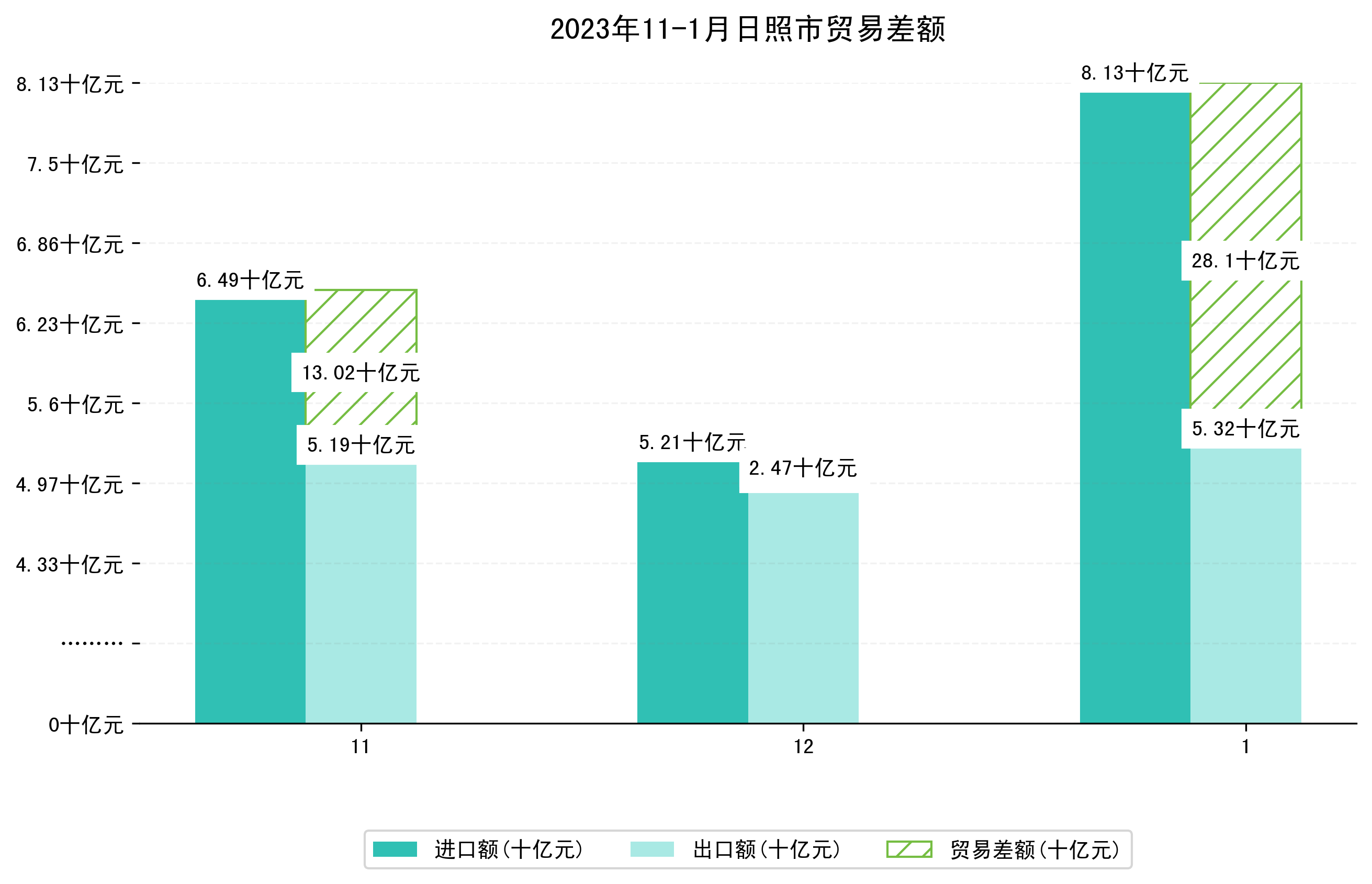 以人民币计,2023年1-1月日照市贸易差额为28,0998,9968万元(贸易逆差),相比上年同期减少了8,3984,4091万元,同比减少42.63%。