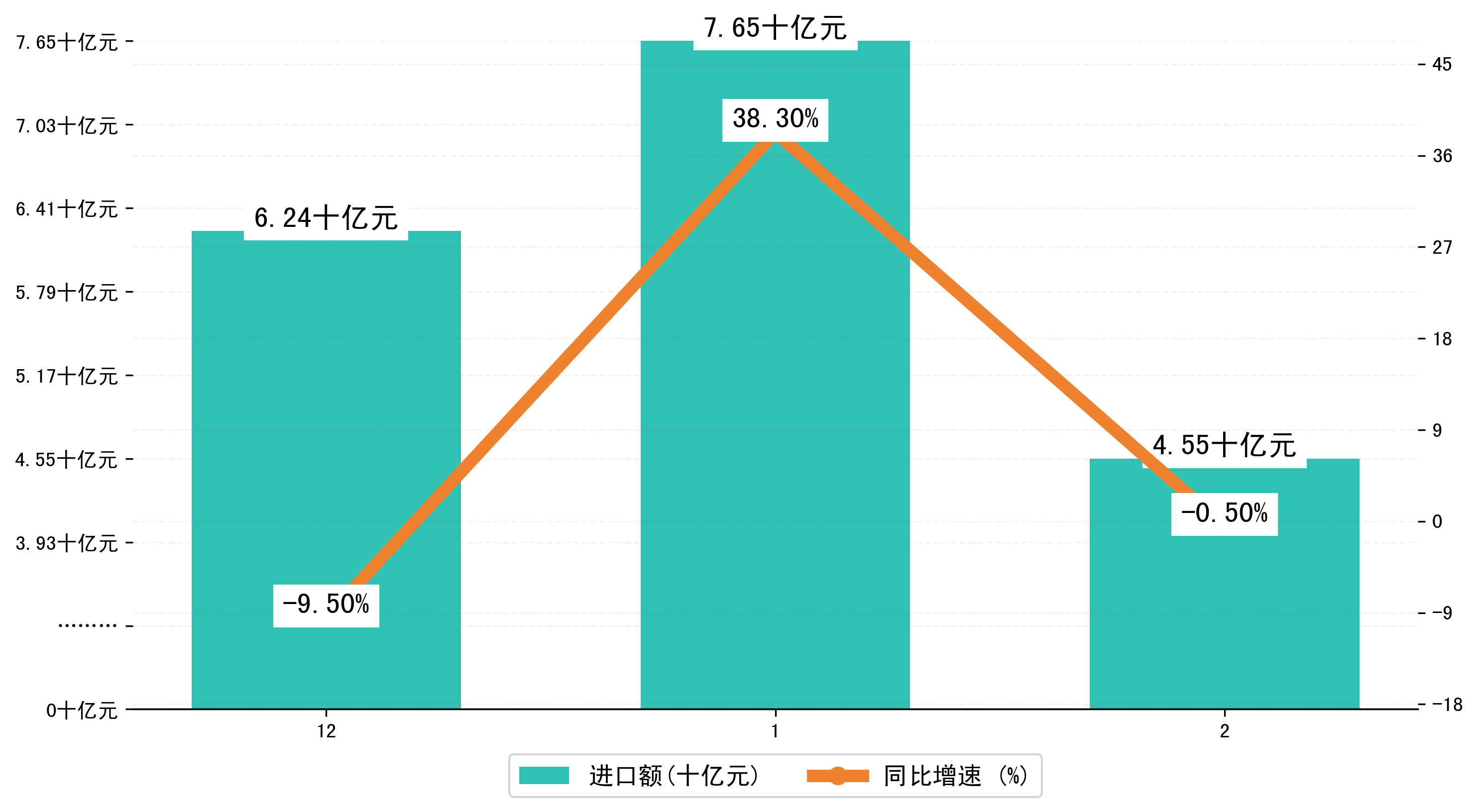 以人民币计,2025年1-2月日照市进口额为121,9950.8653万元,相比上年同期减少了1,7928.7652万元,同比减少了-0.50%。