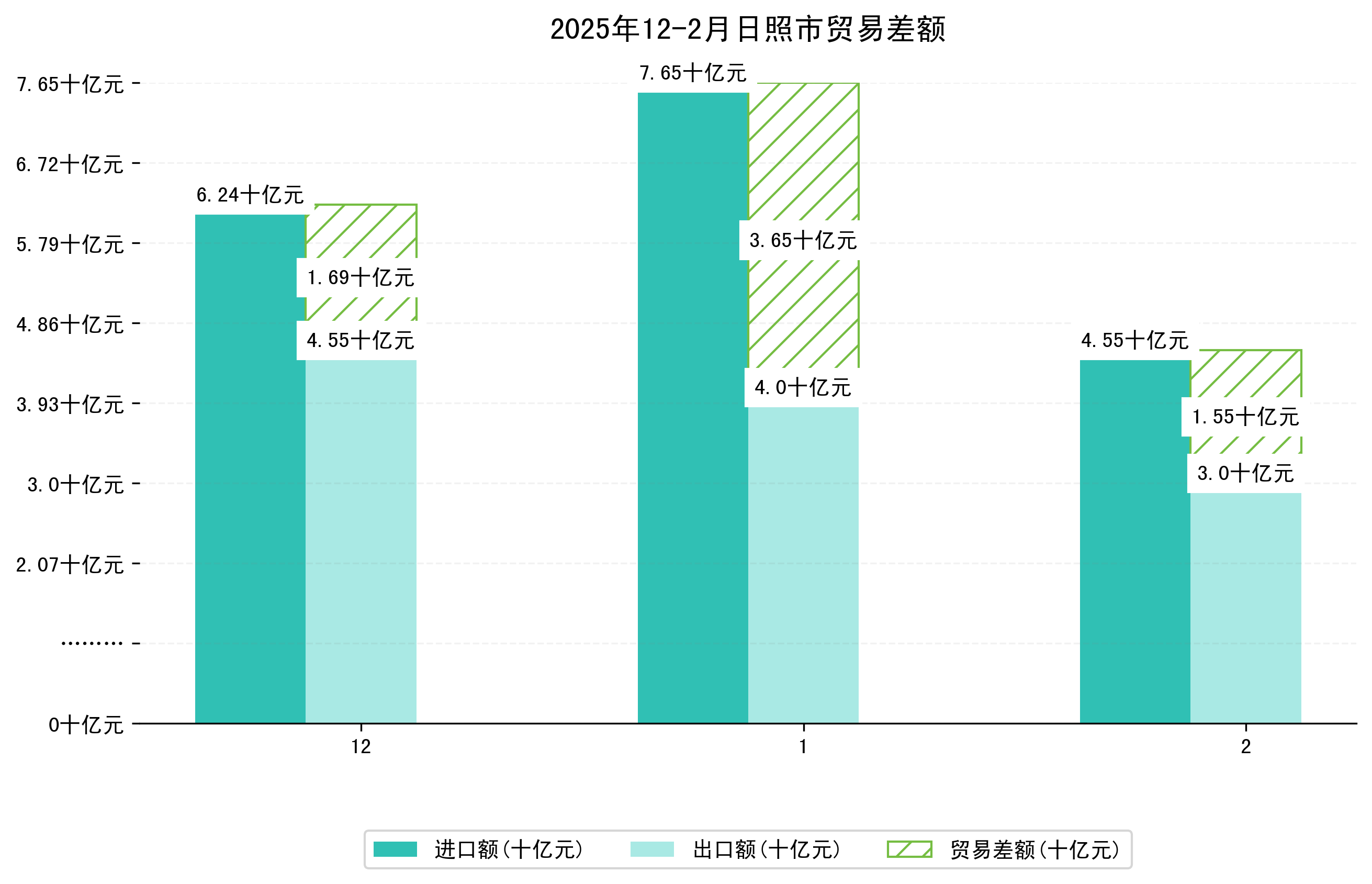 一、2025年2月日照市单月出口总额及进出口差额统计分析