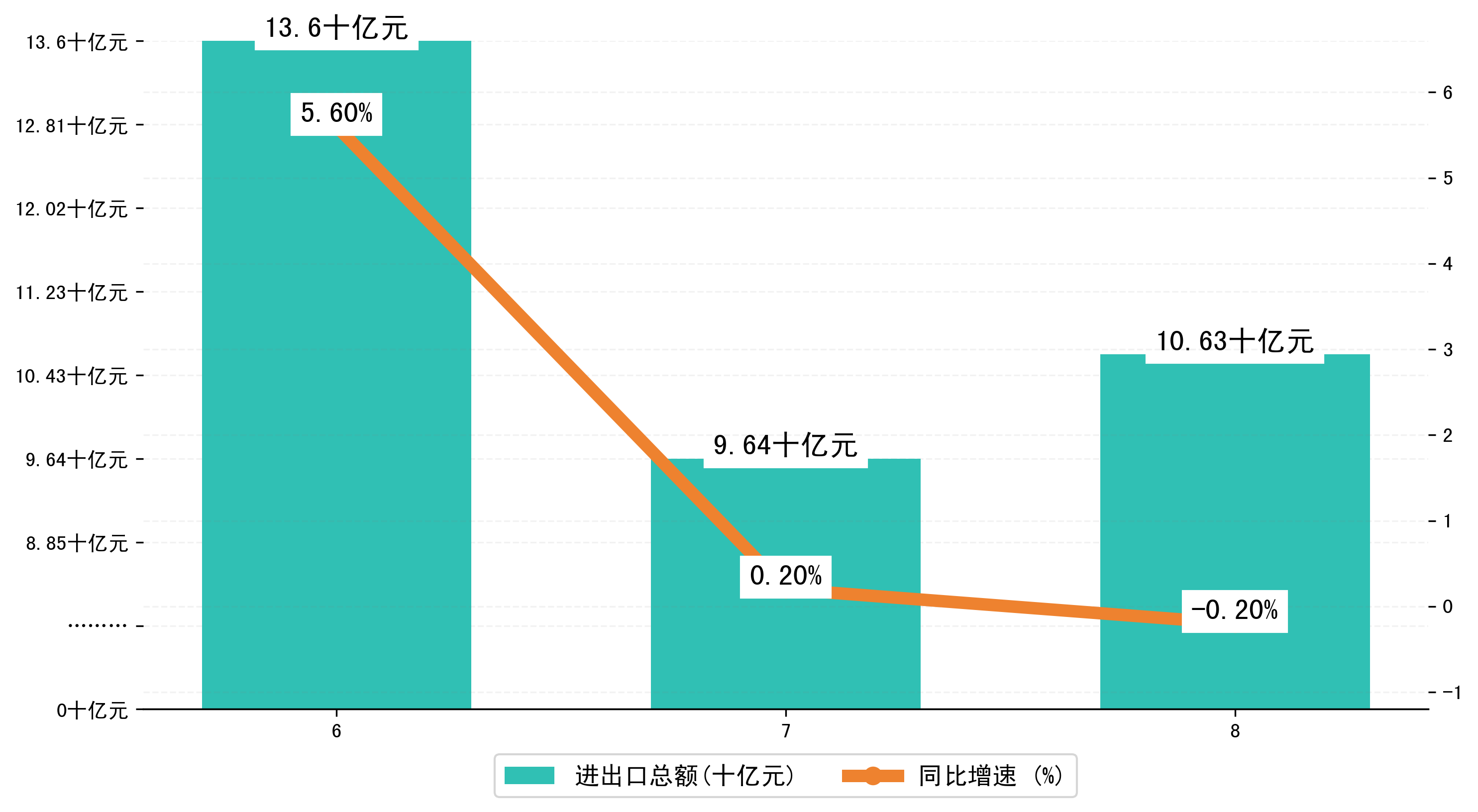 以人民币计,2023年1-8月日照市进出口总额为919,9536.8013万元,相比上年同期减少了29,2862.7296万元,同比减少了-0.20%。
