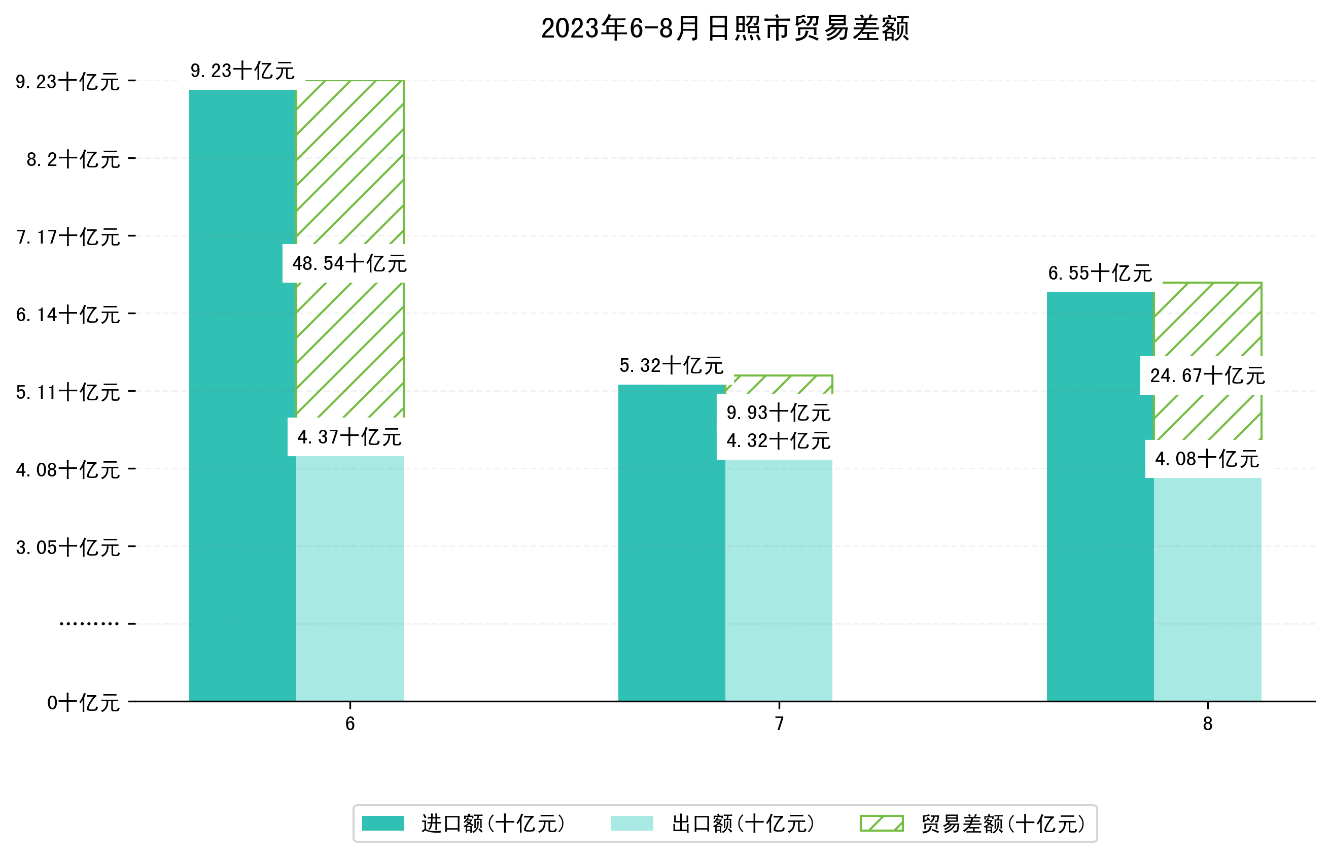 以人民币计,2023年1-8月日照市贸易差额为230,5468,3811万元(贸易逆差),相比上年同期减少了12,4378,4346万元,同比减少5.7%。
