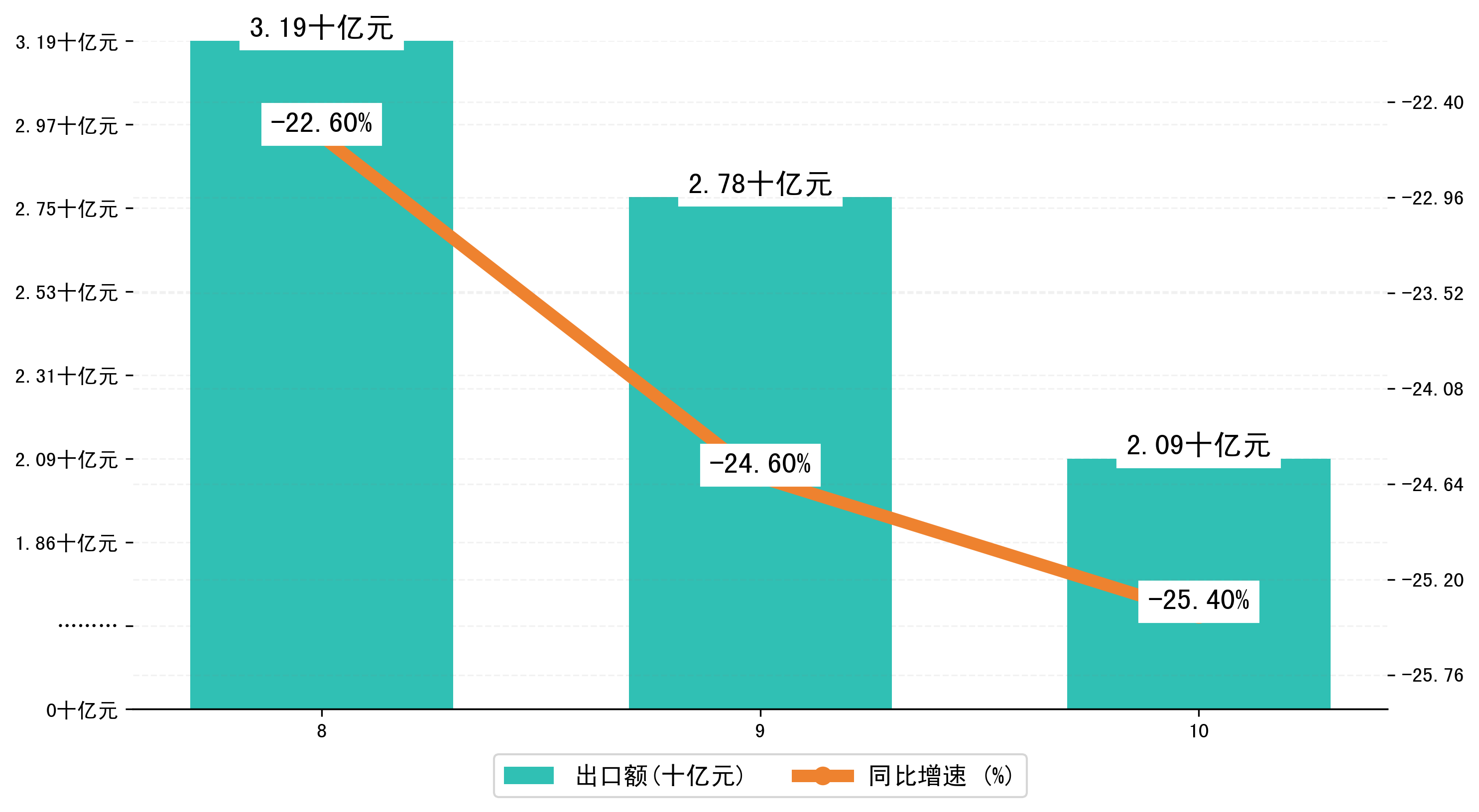 以人民币计,2024年10月上饶市出口额为20,8558.0065万元,相比上月减少了6,9232.1986万元;相比上年同期减少了12,8388.5614万元,同比减少了-25.40%。