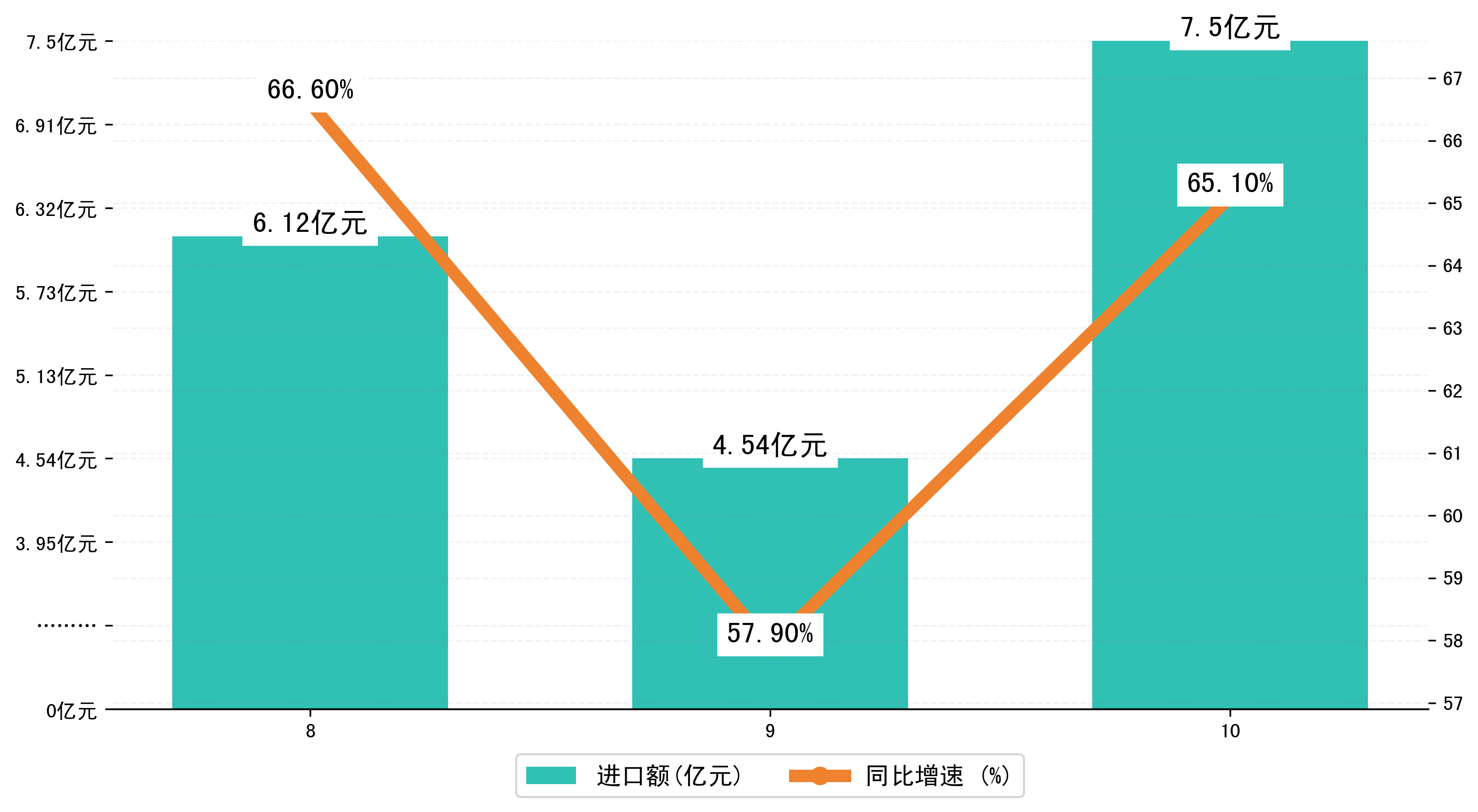 以人民币计,2024年10月上饶市进口额为7,5045.8653万元,相比上月增加了2,9625.6141万元;相比上年同期增加了4,3496.7872万元,同比增加了65.10%。