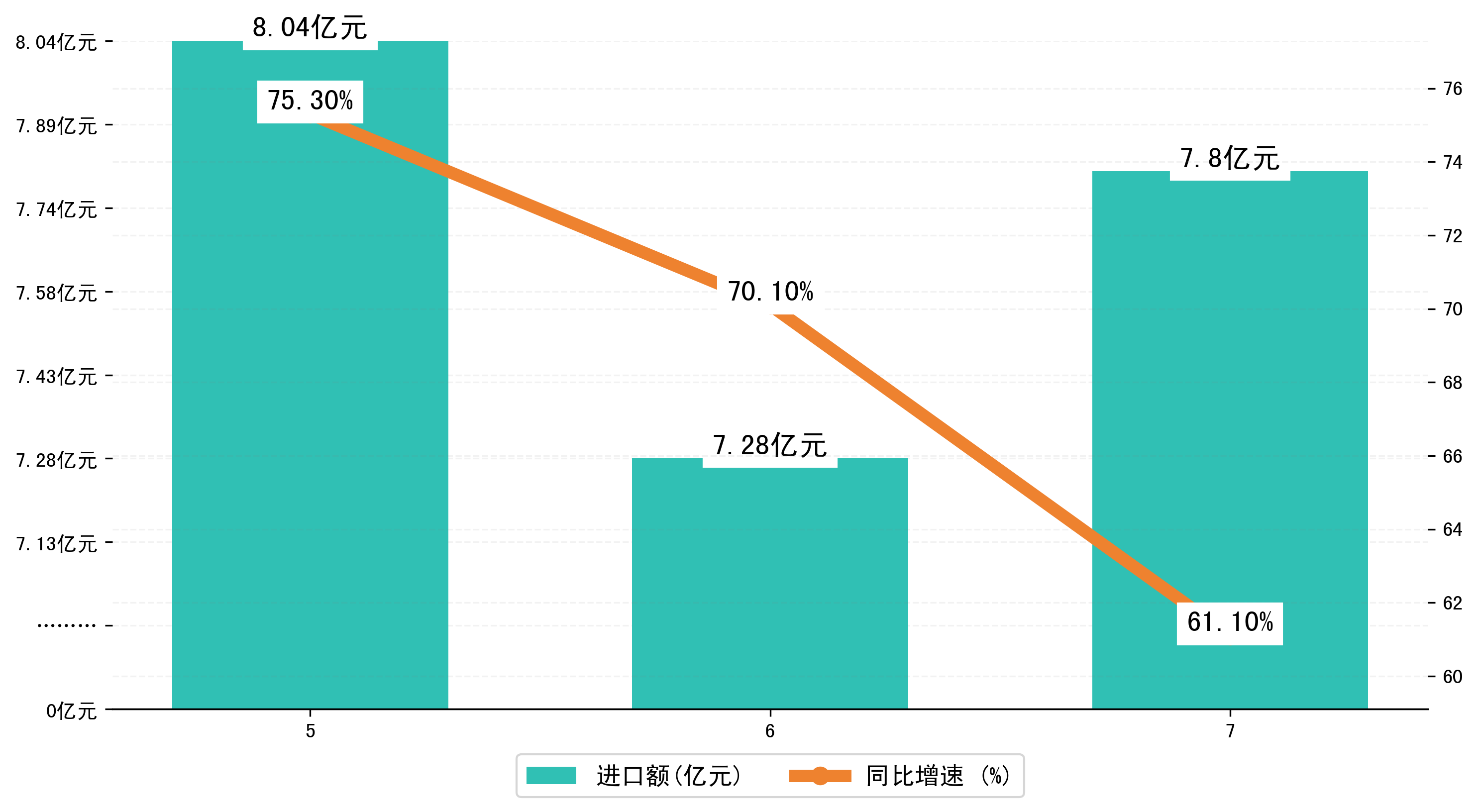 以人民币计,2024年7月上饶市进口额为7,8033.9866万元,相比上月增加了5228.6108万元;相比上年同期增加了1,5921.5476万元,同比增加了61.10%。