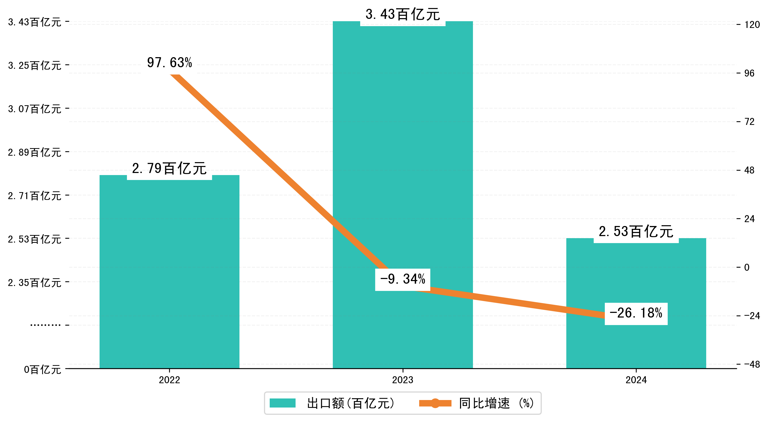 以人民币计,2024年1-7月上饶市出口额为253,0316.3119万元,相比上年同期减少了89,7459.0338万元,同比减少了-21.60%。