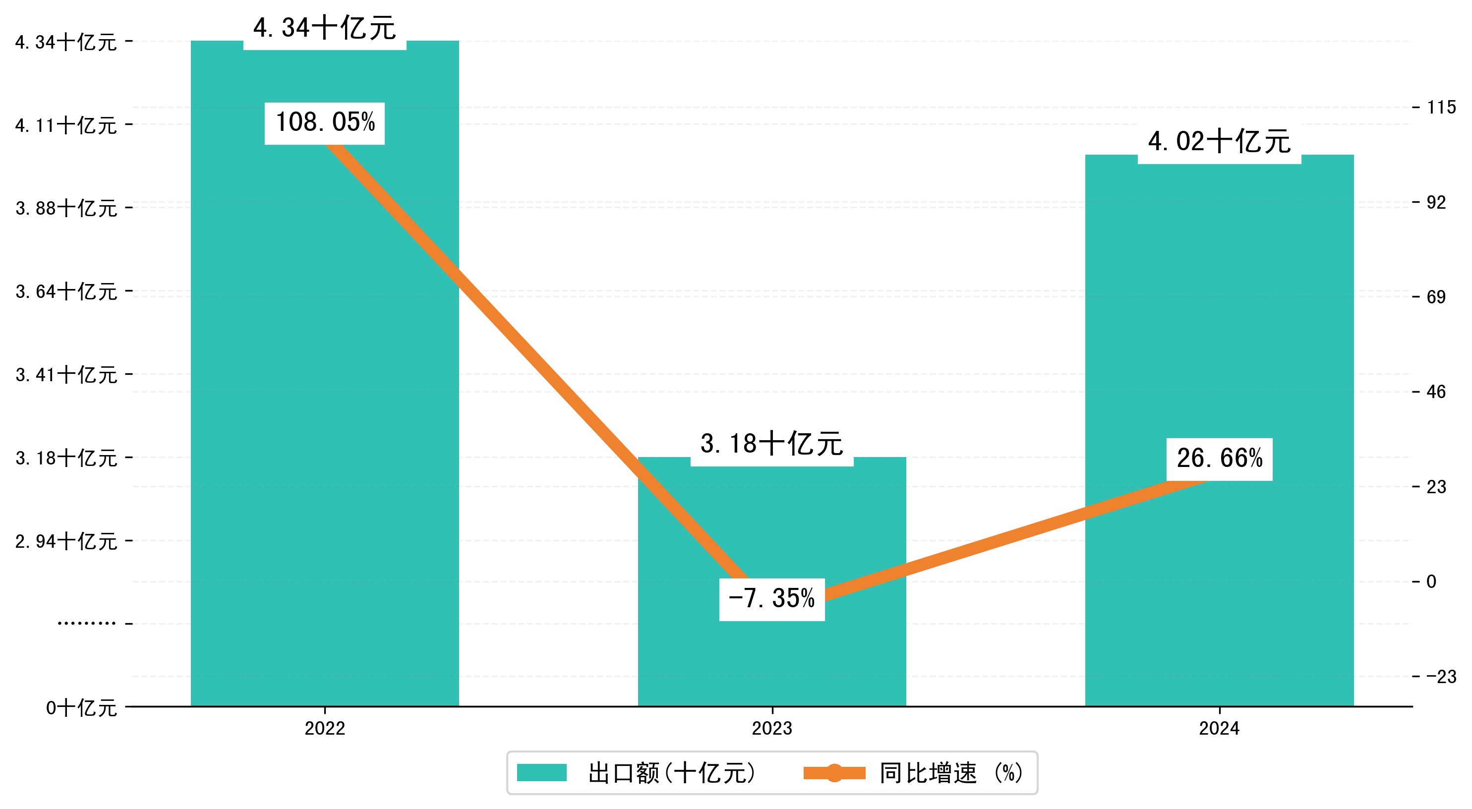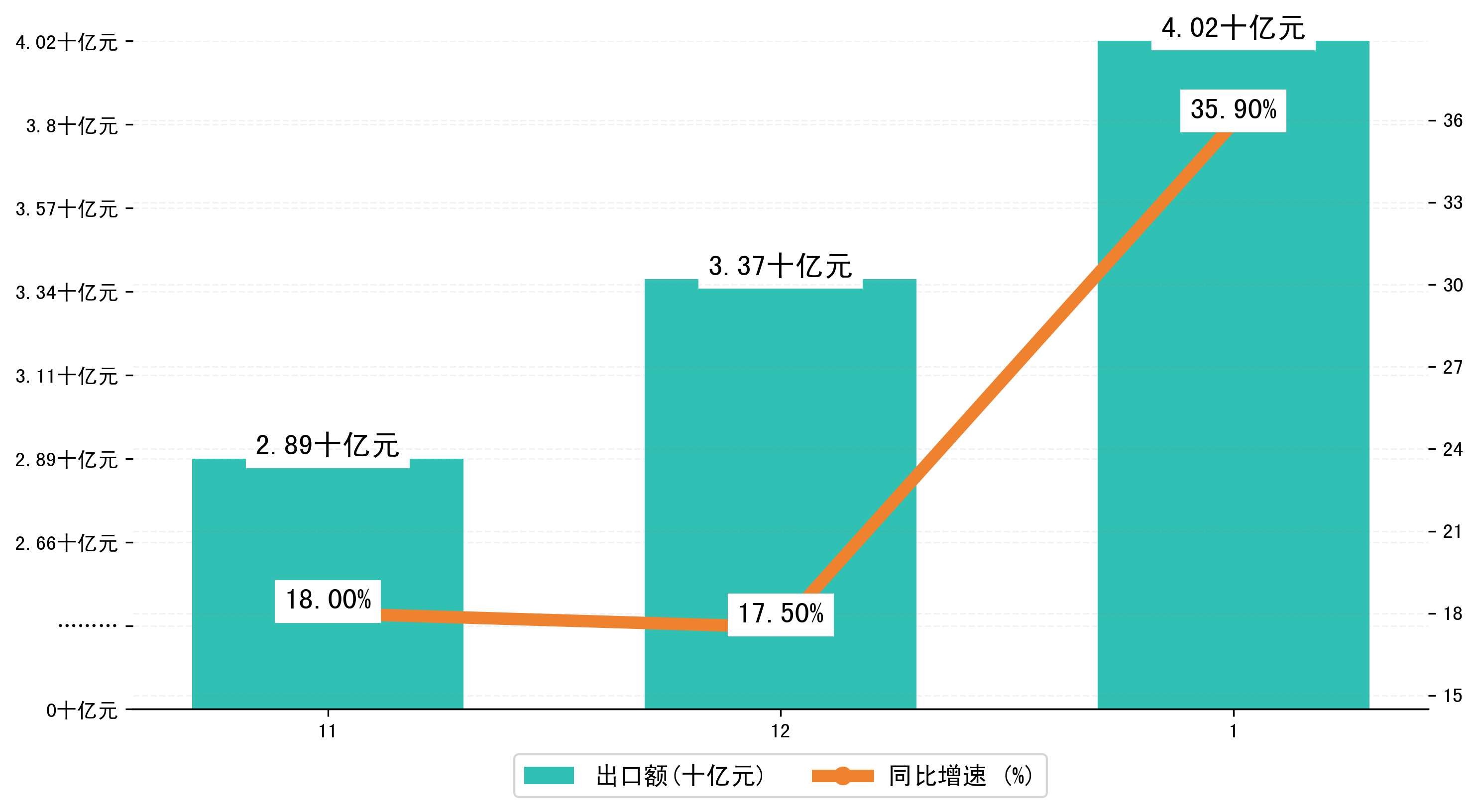 以人民币计,2024年1-1月上饶市出口额为40,2254.4386万元,相比上年同期增加了8,4674.8498万元,同比增加了35.90%。
