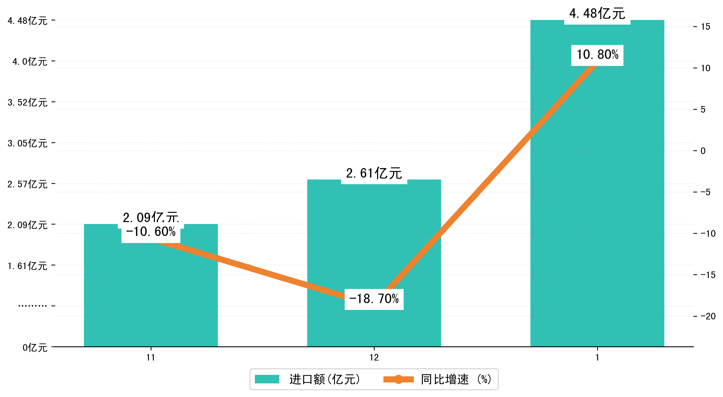 以美元计,2024年1-1月上饶市进口额为6300.8812万美元,相比上年同期增加了517.0999万美元,同比增加8.70%。