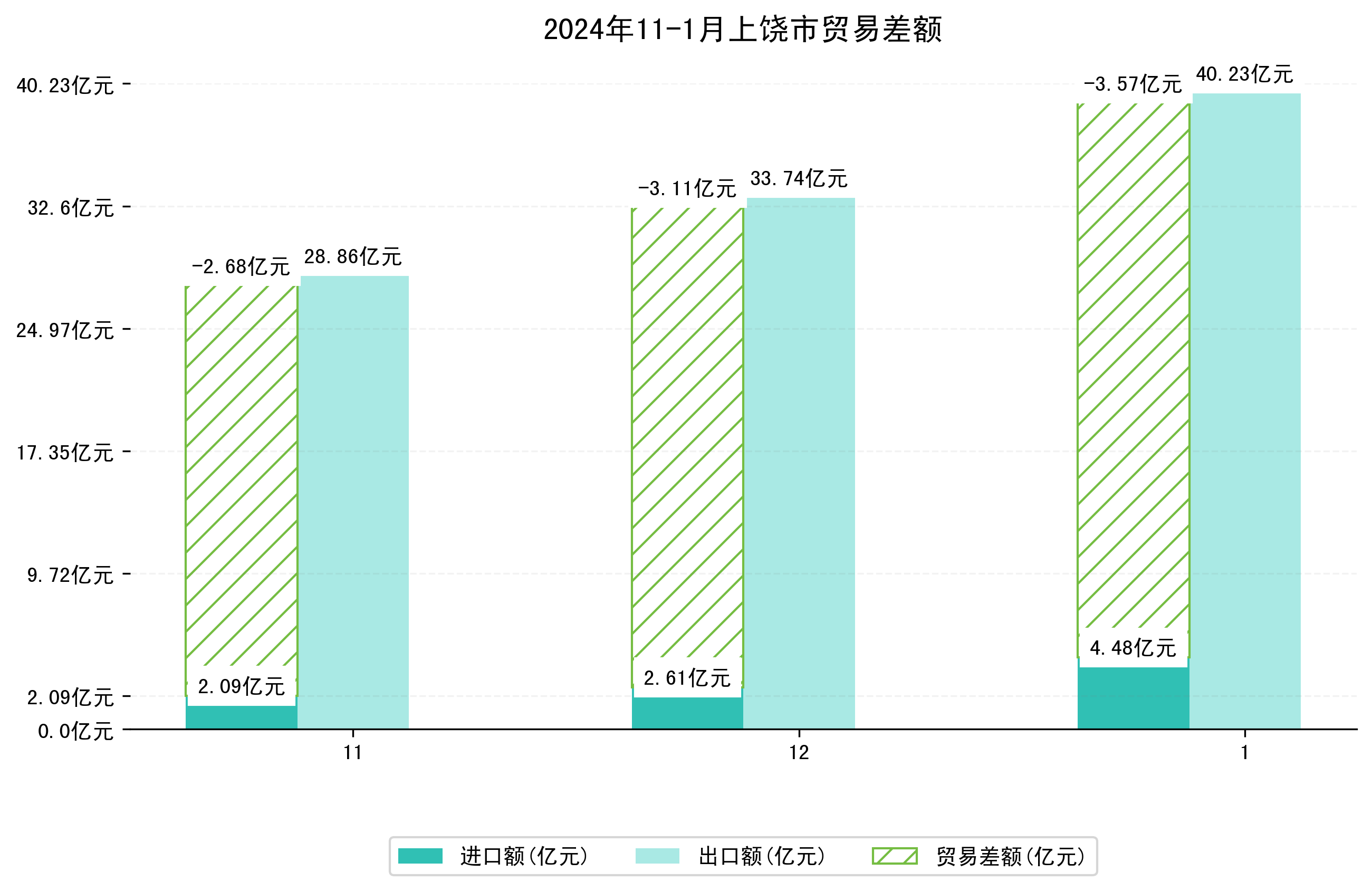 以人民币计,2024年1-1月上饶市贸易差额为35,7483,2623万元(贸易顺差),相比上年同期增加了8,0253,8907万元,同比增加28.95%。