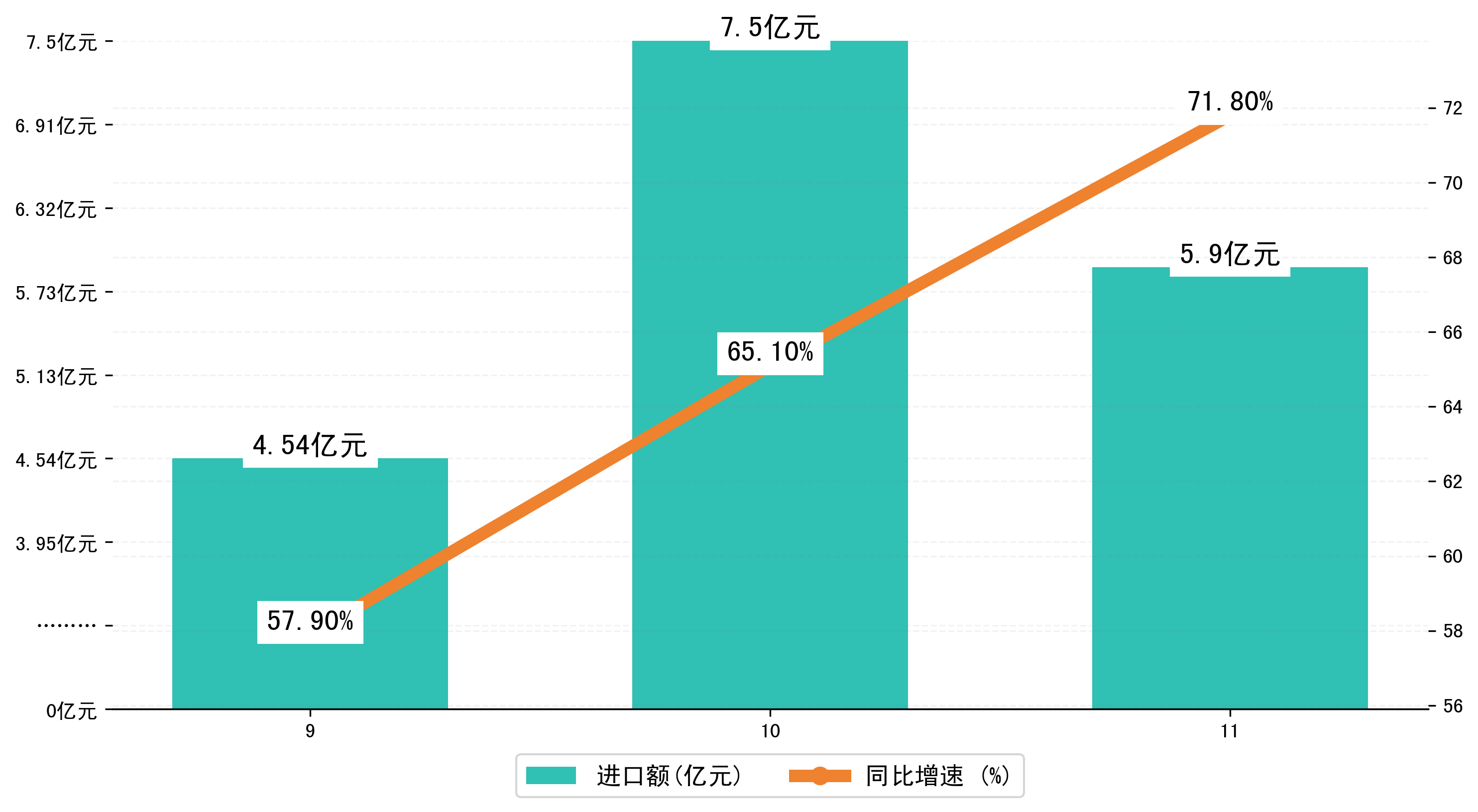 以人民币计,2024年1-11月上饶市进口额为71,7909.0538万元,相比上年同期增加了29,5737.1461万元,同比增加了71.80%。