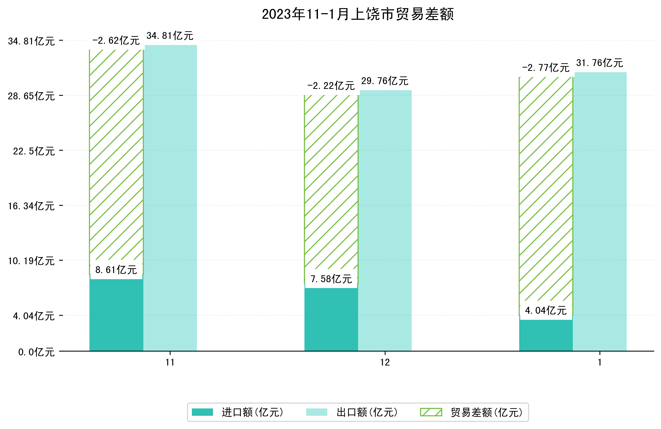 以人民币计,2023年1-1月上饶市进出口总额为35,7929.8061万元,相比上年同期减少了11,5299.2014万元,同比减少了-24.30%。