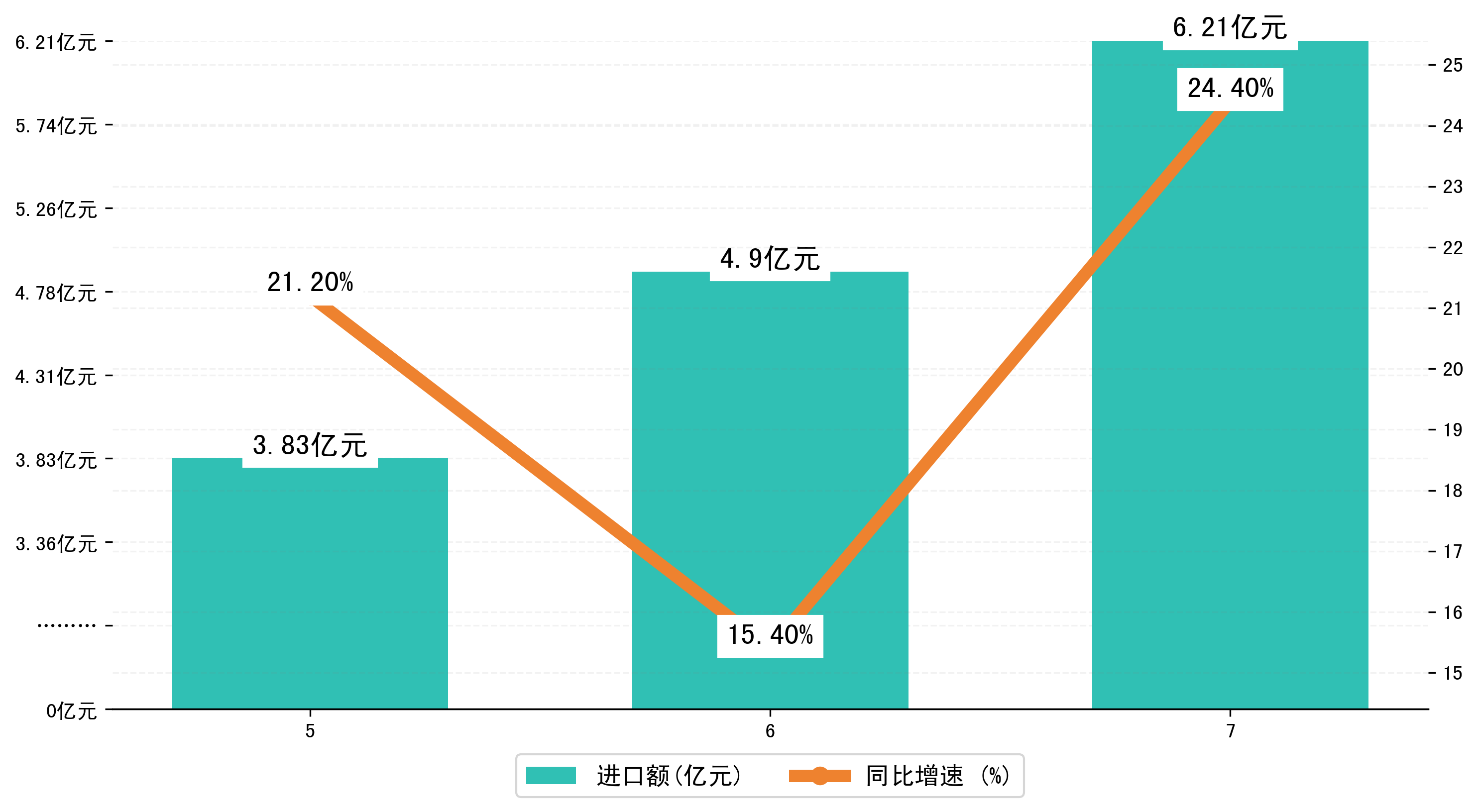 以人民币计,2023年7月上饶市进口额为6,2112.439万元,相比上月增加了1,3147.2846万元;相比上年同期增加了2,2936.9022万元,同比增加了24.40%。