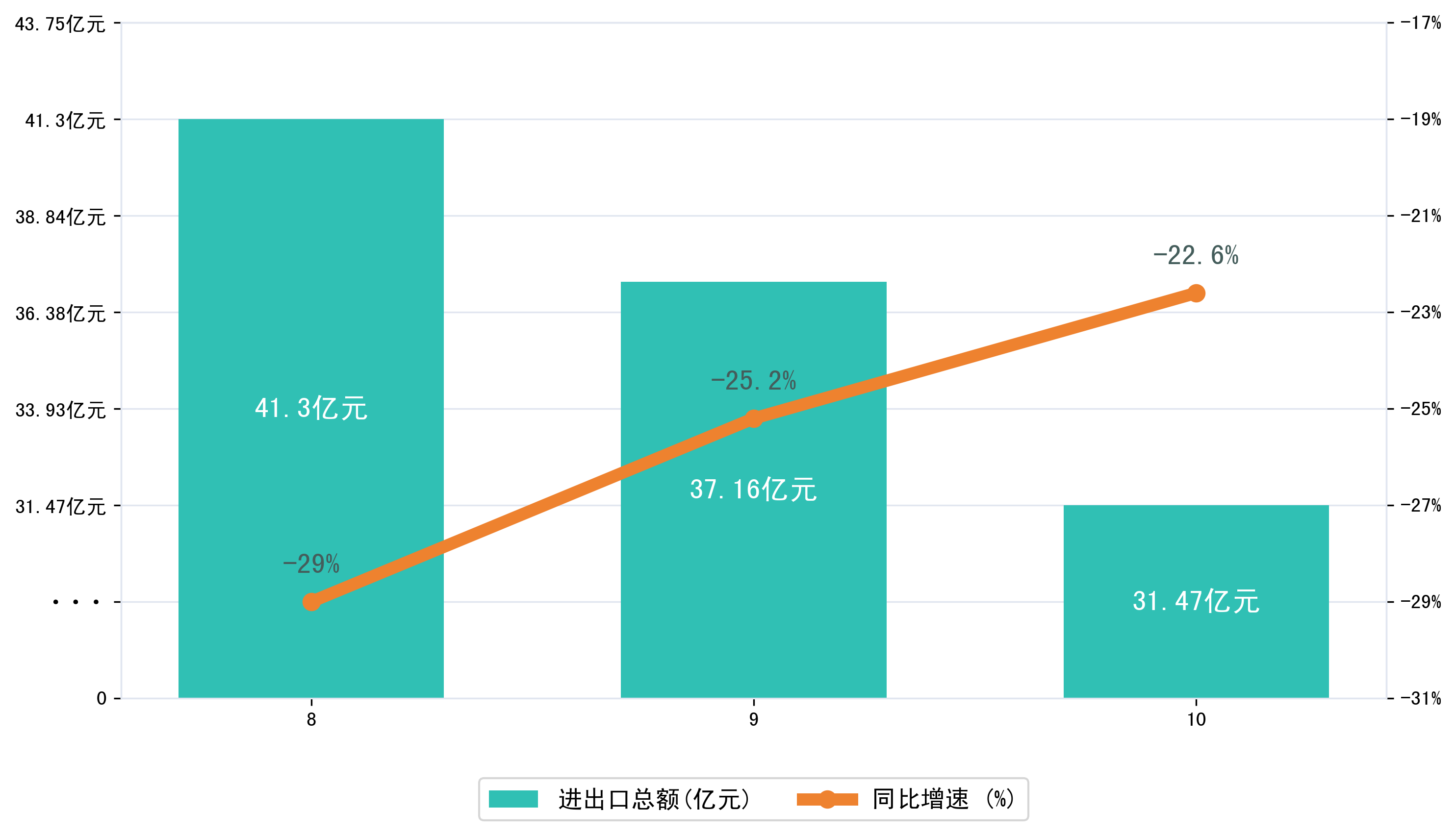 以美元计,2025年10月上饶市进出口总额为4,4221.7601万美元,相比上月减少了7837.9277万美元;相比上年同期增加了4249.4616万美元,同比减少-23.20%。