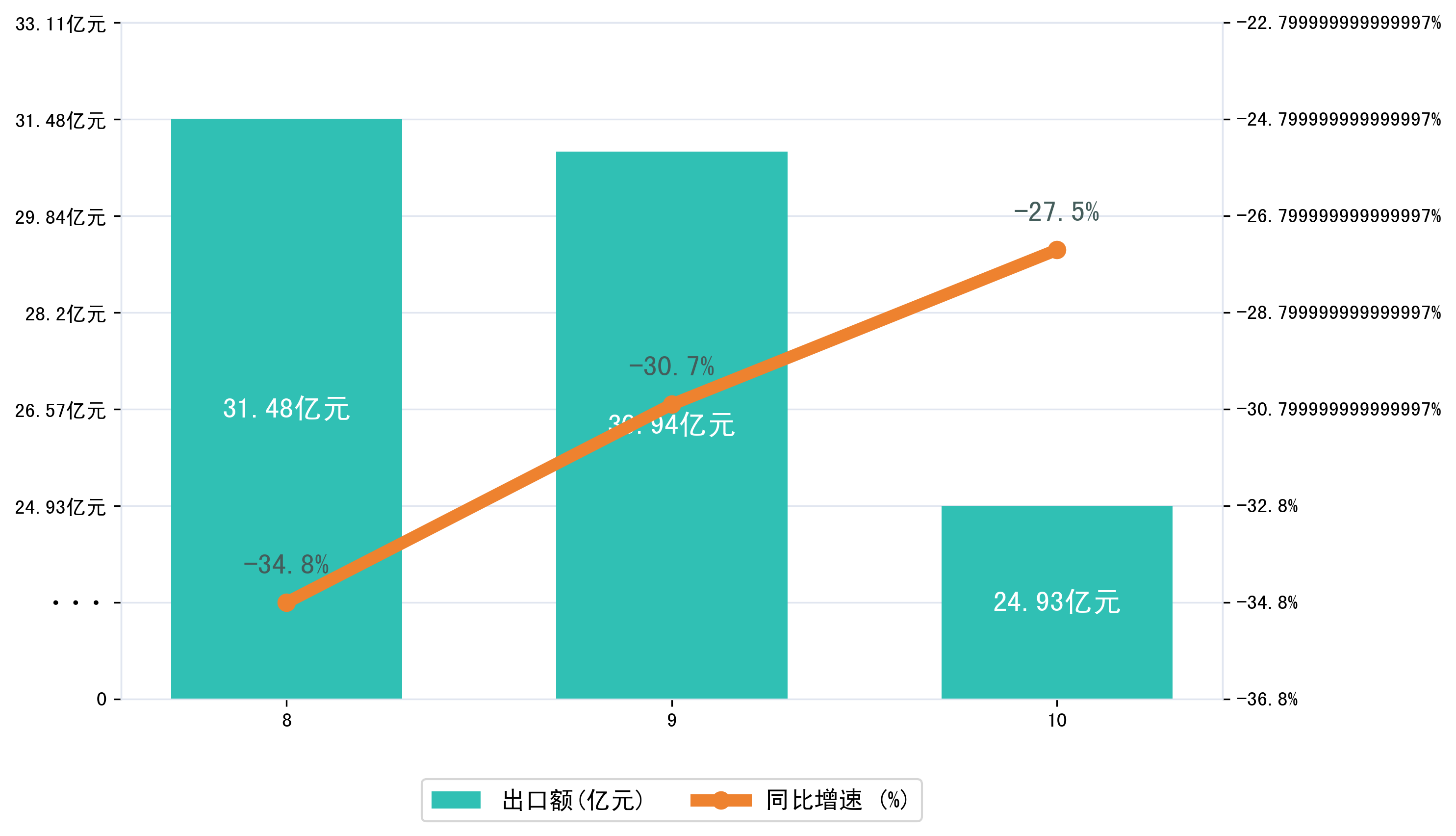 以人民币计,2025年10月上饶市出口额为24,9292.8979万元,相比上月减少了6,0065.6745万元;相比上年同期增加了4,0734.8914万元,同比减少了-27.50%。