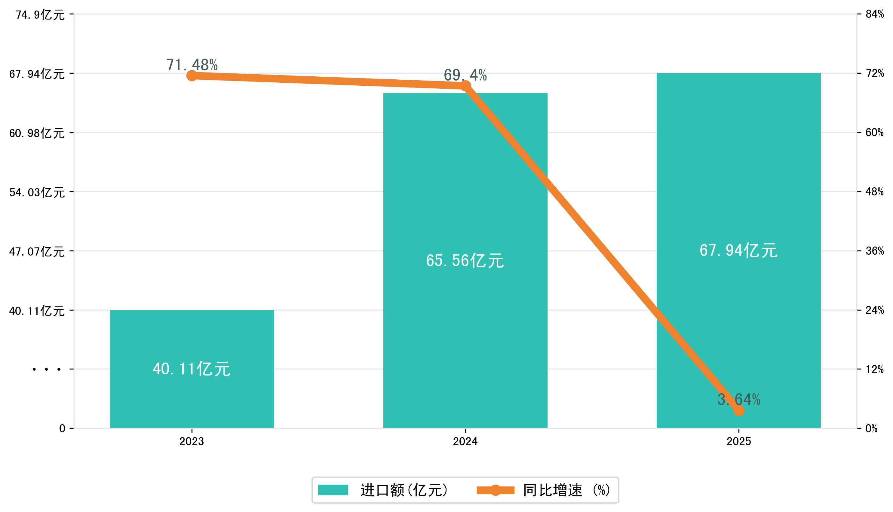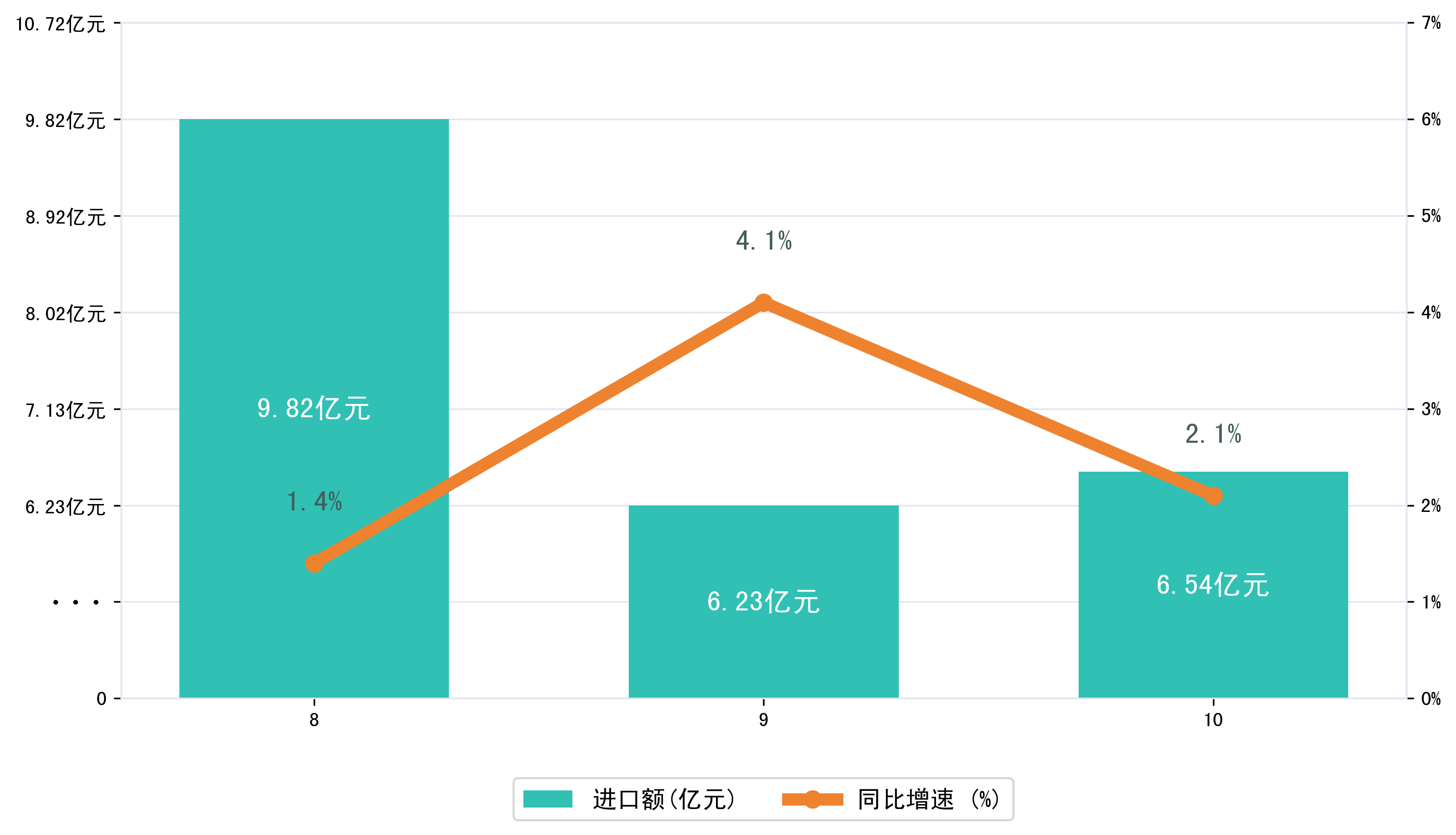 以人民币计,2025年10月上饶市进口额为6,5416.8698万元,相比上月增加了3138.5435万元;相比上年同期减少了9628.9955万元,同比增加了2.10%。