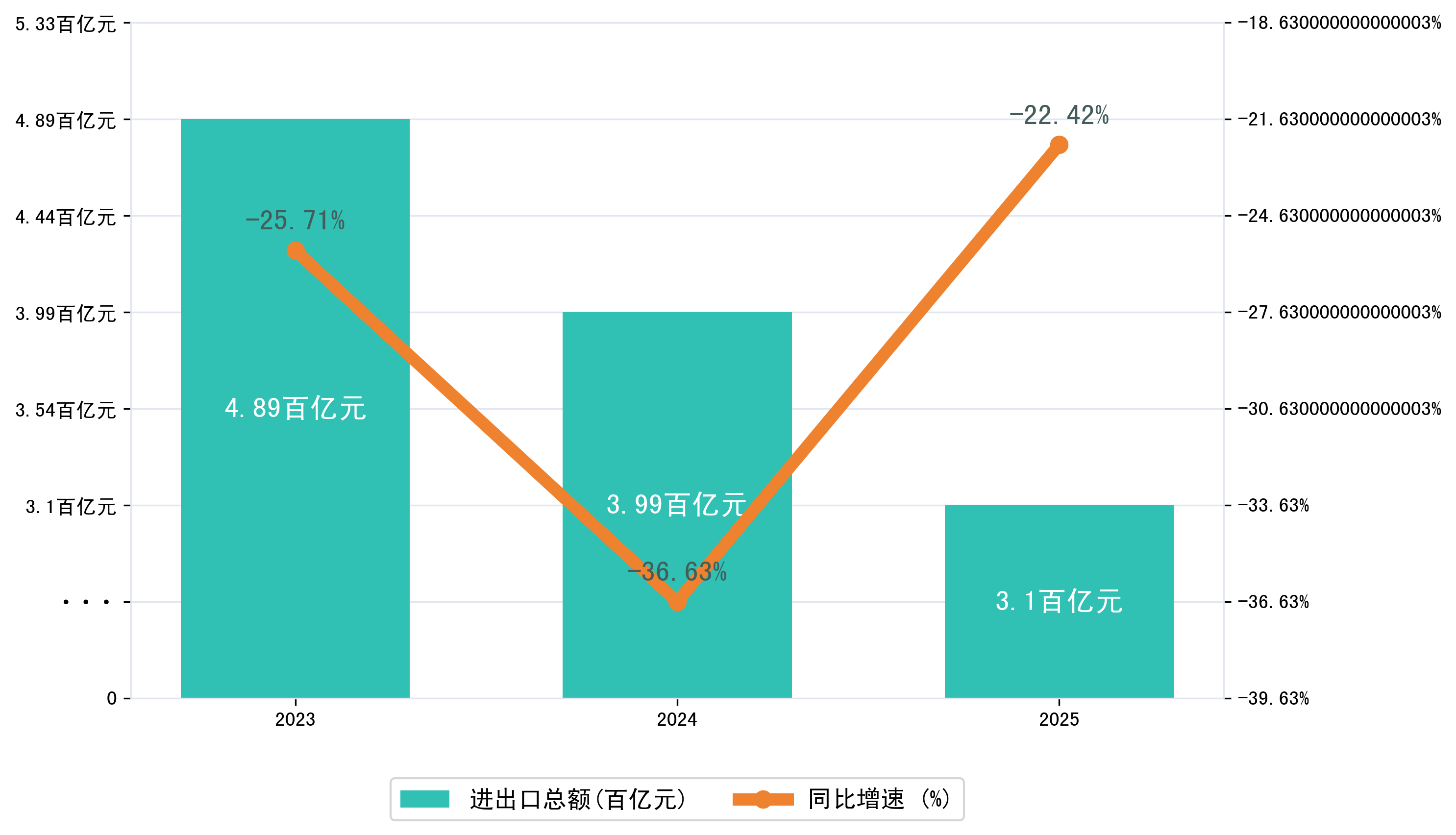 以人民币计,2025年1-10月上饶市进出口总额为309,6604.9274万元,相比上年同期减少了89,4833.1435万元,同比减少了-22.60%。