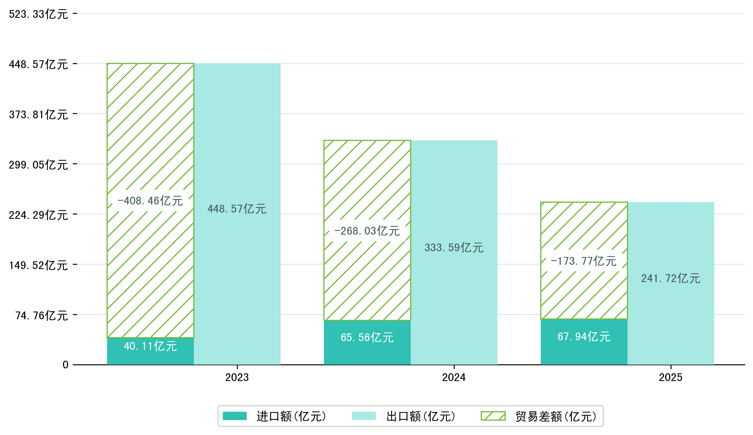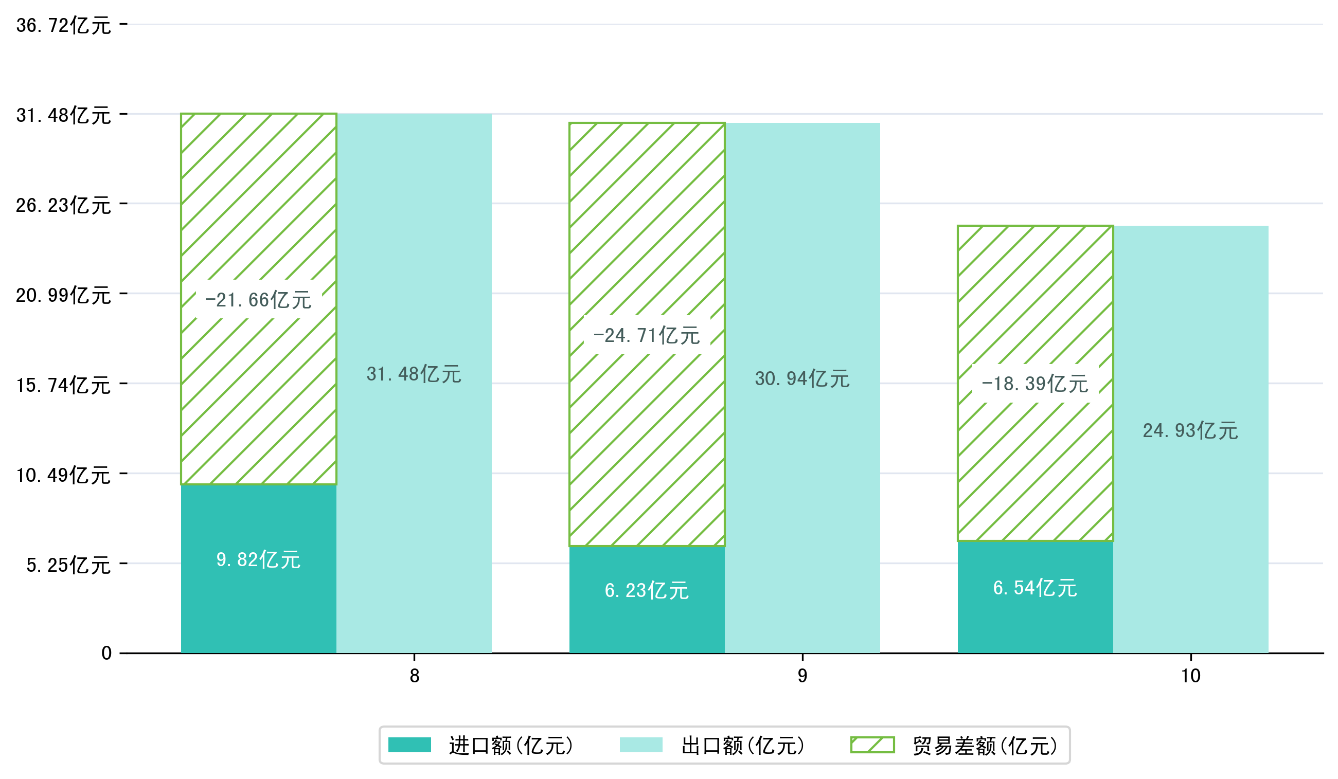 以美元计,2025年1-10月上饶市贸易差额为24,2386,8796万美元(贸易顺差),相比上年同期减少了13,4434,3747万美元,同比减少-35.68%。