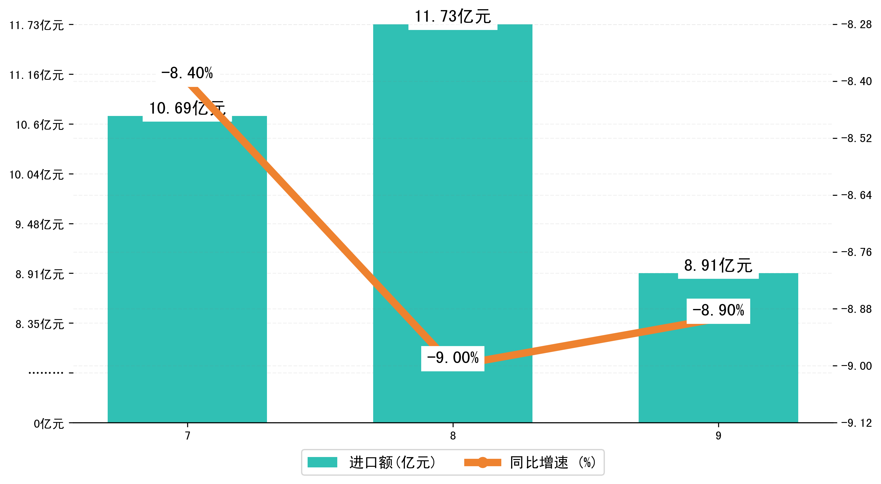以人民币计,2023年9月汕头市进口额为8,9119.0444万元,相比上月减少了2,8158.9147万元;相比上年同期减少了7023.1327万元,同比减少了-8.90%。