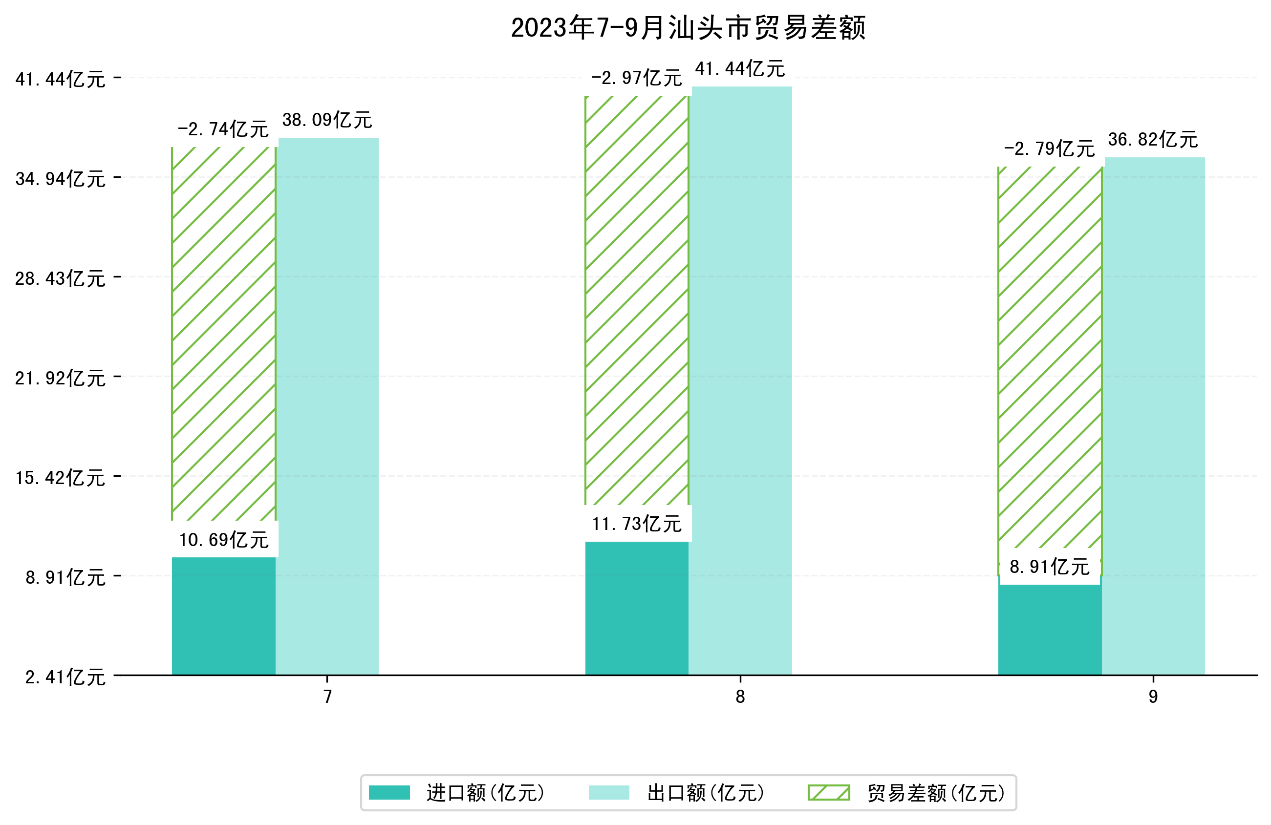 以人民币计,2023年9月汕头市贸易差额为27,9071,8659万元(贸易顺差),相比上月减少了1,8082,5064万元,即2740,2339万美元;相比上年同期减少了9103,8105万元,同比减少-3.16%。