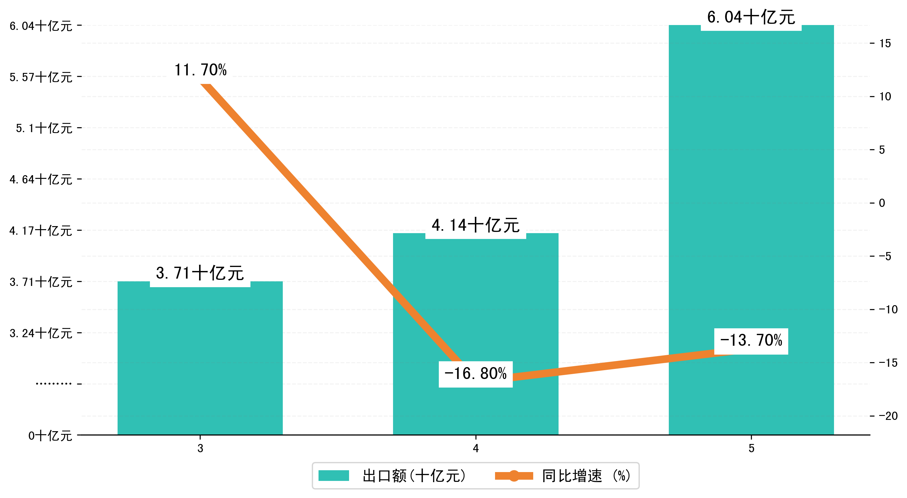 以人民币计,2023年5月汕头市出口额为60,3571.8079万元,相比上月增加了18,9193.4899万元;相比上年同期减少了1,7515.3186万元,同比减少了-13.70%。