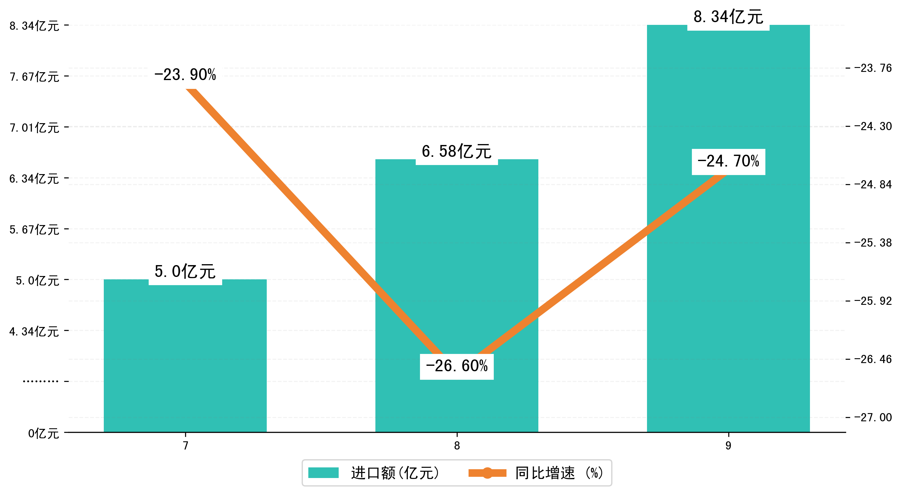 以美元计,2024年1-9月汕头市进口额为10,1714.0902万美元,相比上年同期减少了3,6945.3357万美元,同比减少-26.20%。