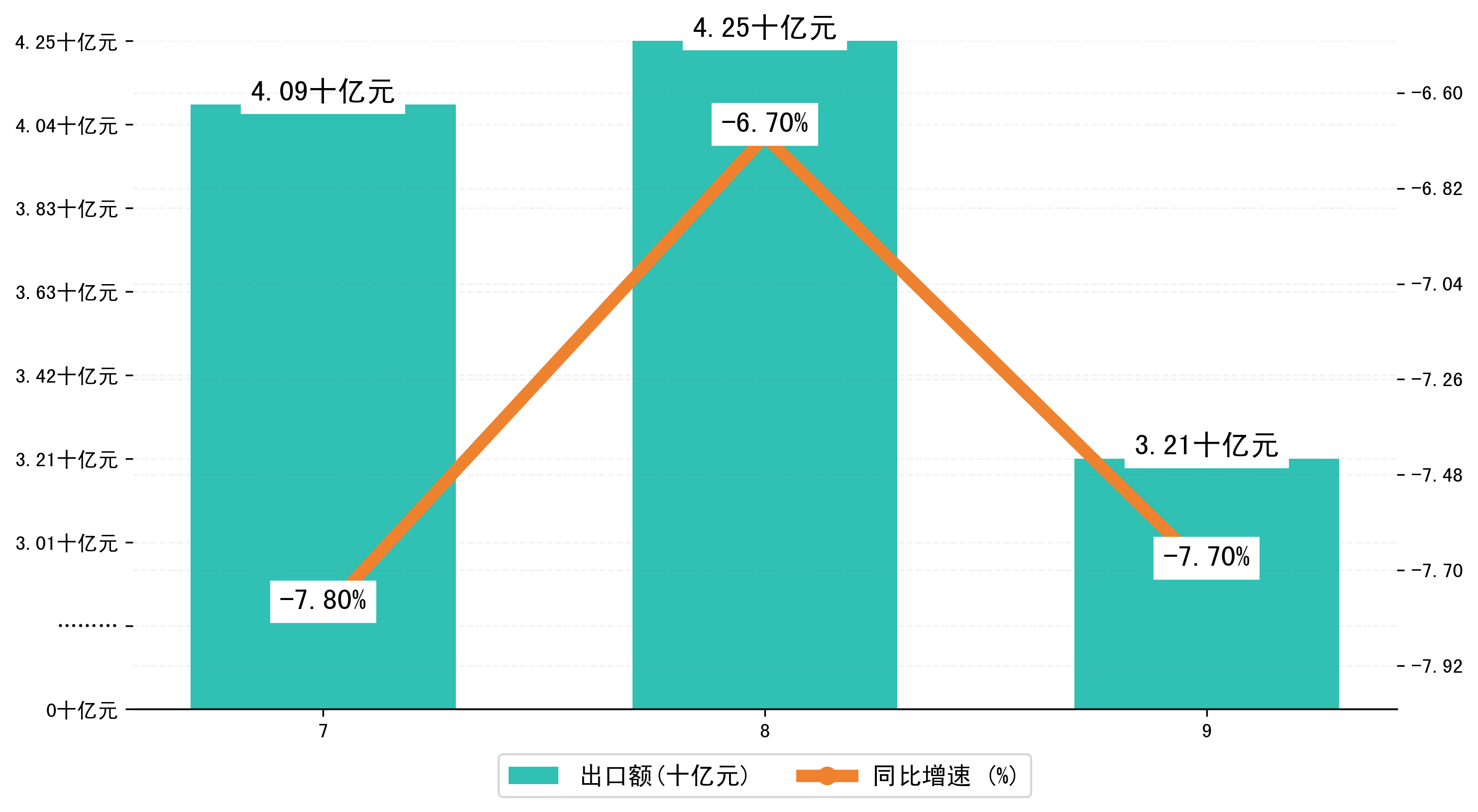 以人民币计,2025年1-9月汕头市出口额为314,5007.0615万元,相比上年同期减少了26,4266.1223万元,同比减少了-7.70%。