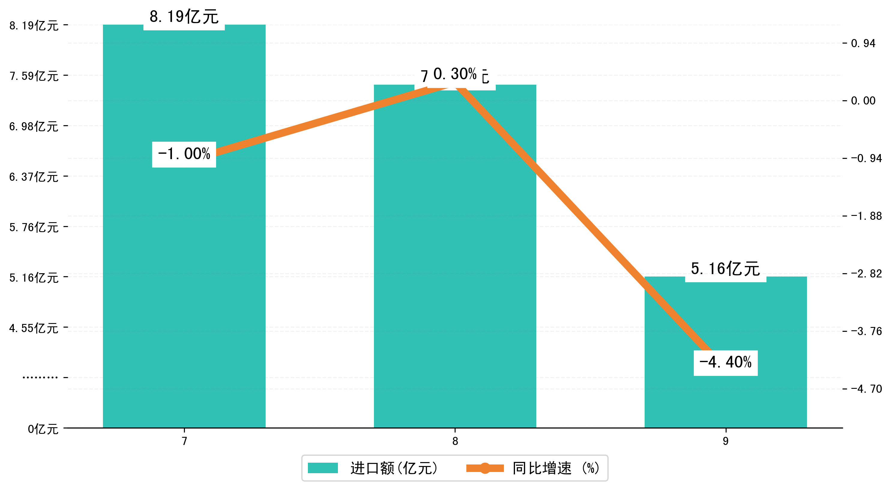 以人民币计,2025年9月汕头市进口额为5,1565.8313万元,相比上月减少了2,3131.2247万元;相比上年同期减少了3,1832.2579万元,同比减少了-4.40%。