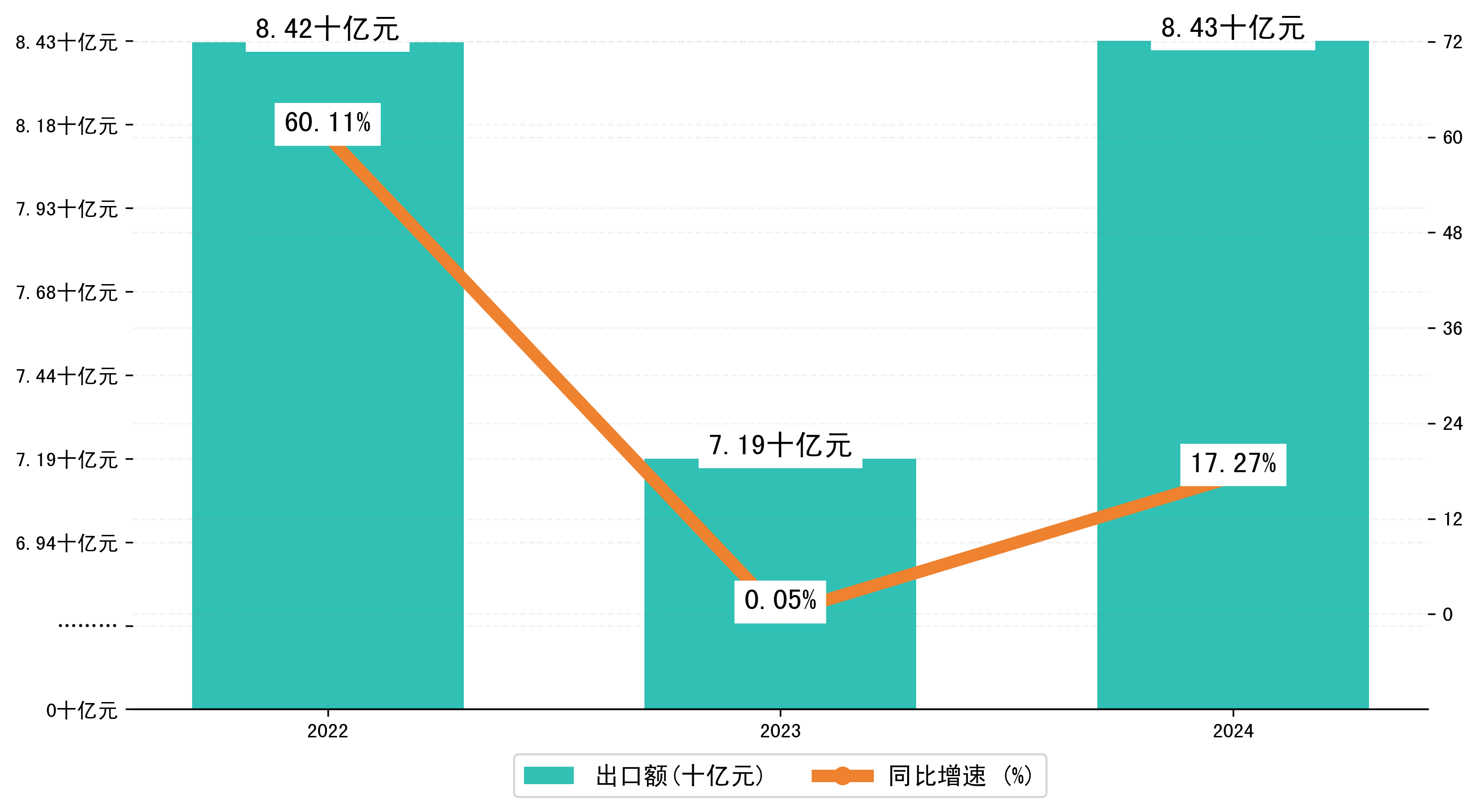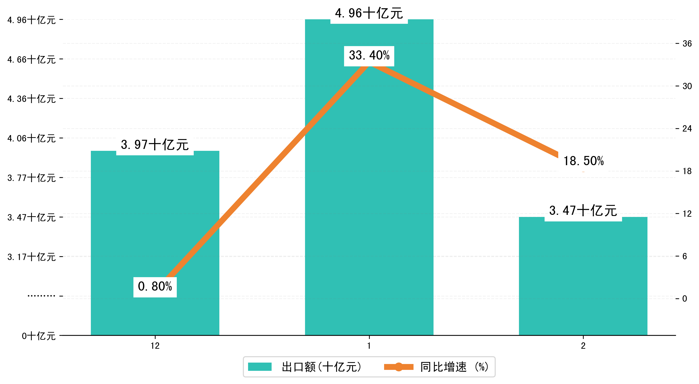 以人民币计,2024年1-2月沈阳市出口额为84,2811.5465万元,相比上年同期增加了12,4137.9465万元,同比增加了18.50%。