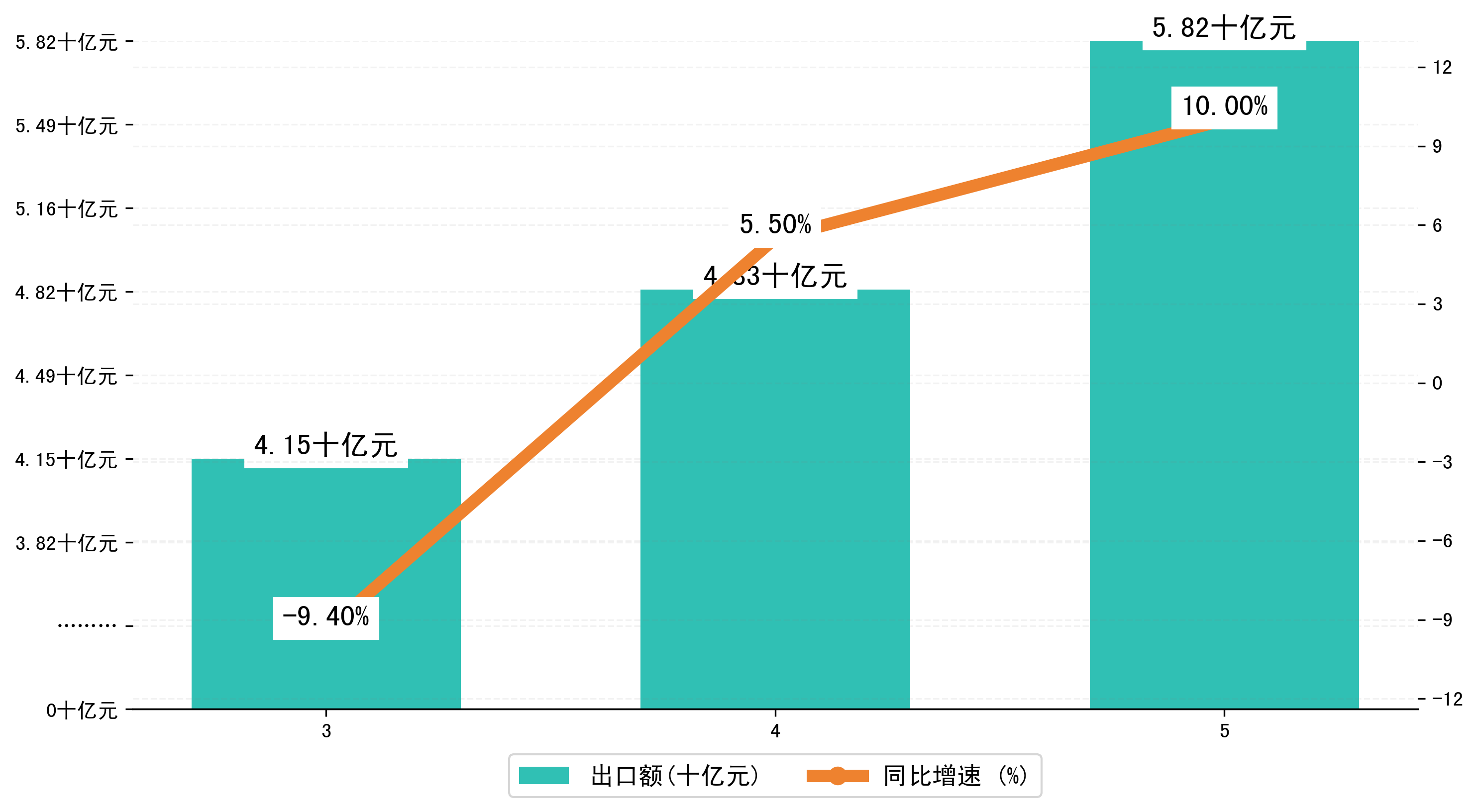 以人民币计,2023年5月沈阳市出口额为58,2347.8225万元,相比上月增加了9,9407.213万元;相比上年同期增加了11,5874.0648万元,同比增加了10.00%。