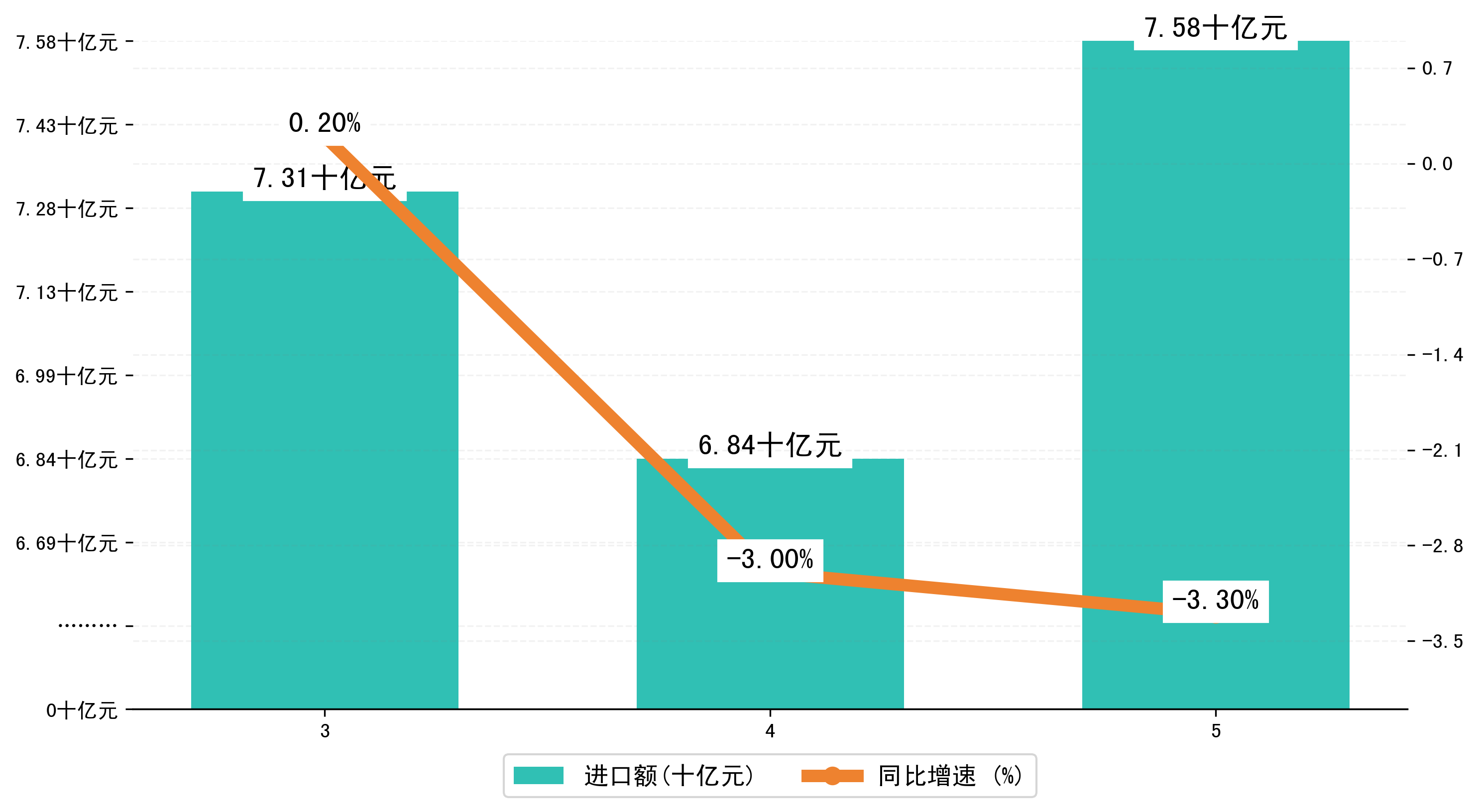 以人民币计,2023年5月沈阳市进口额为75,7545.7368万元,相比上月增加了7,3438.4018万元;相比上年同期减少了3,6324.8563万元,同比减少了-3.30%。