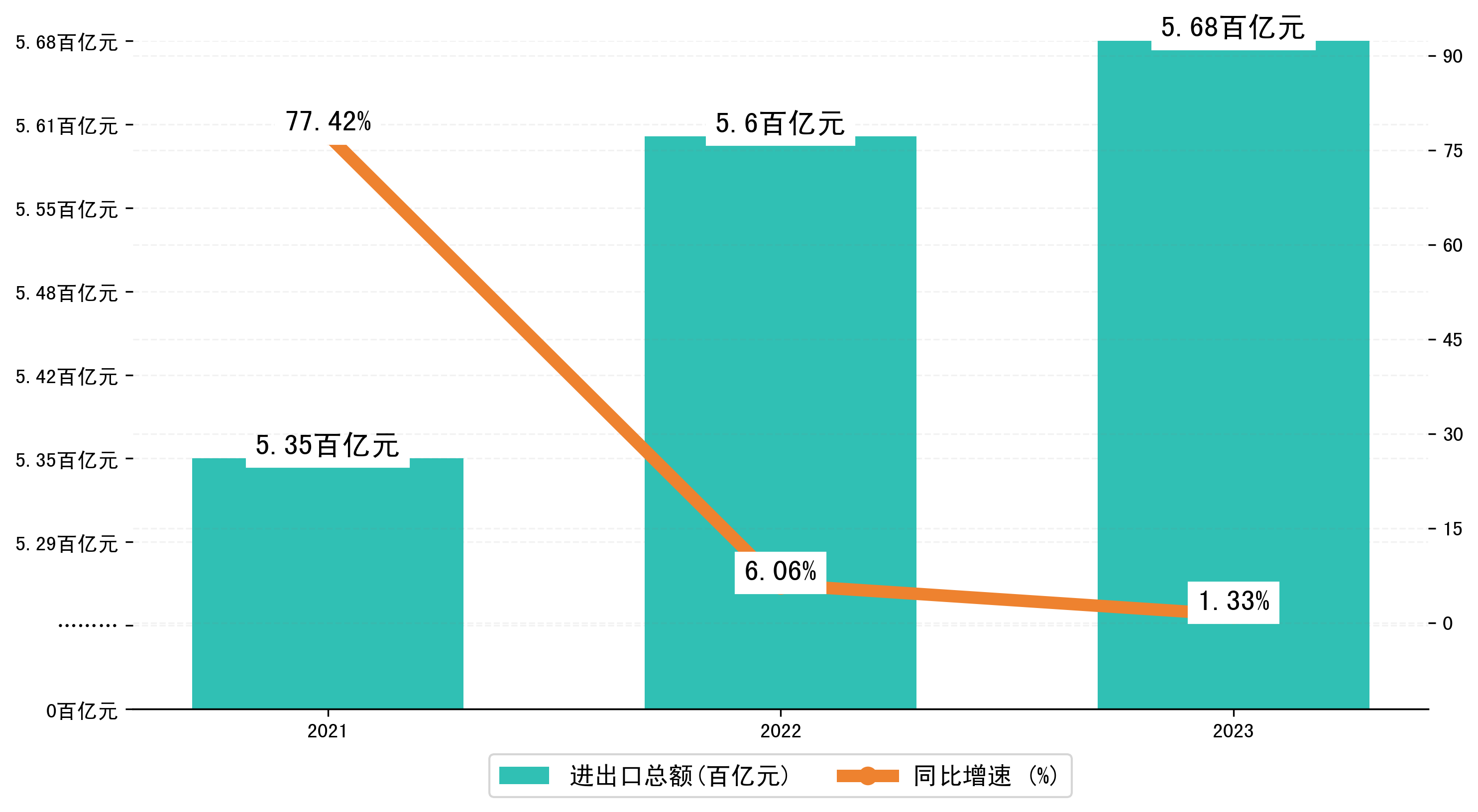 以人民币计,2023年5月沈阳市进出口总额为133,9893.5593万元,相比上月增加了17,2845.6148万元;相比上年同期增加了7,9549.2086万元,同比增加了1.50%。