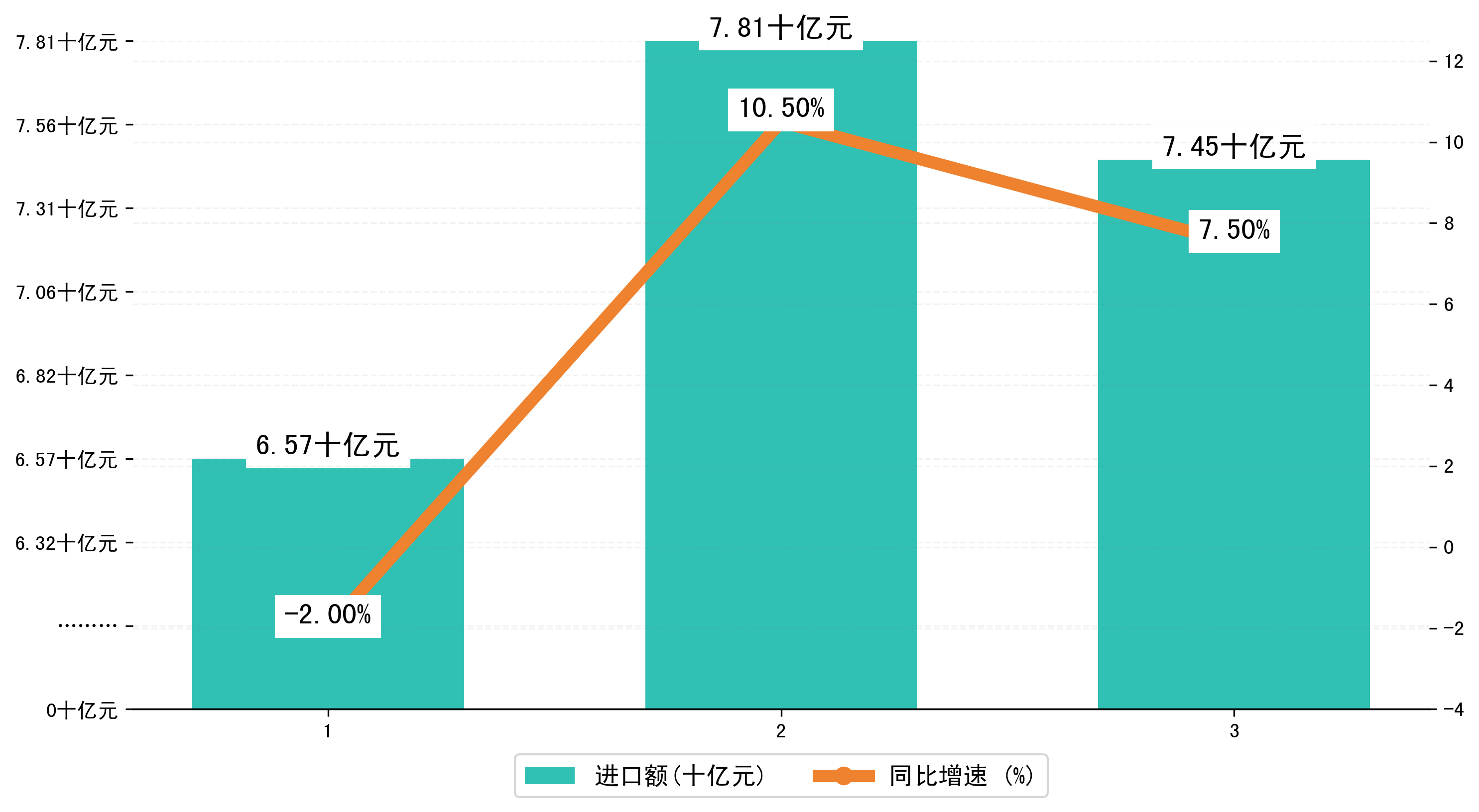 以人民币计,2024年3月沈阳市进口额为74,5487.881万元,相比上月减少了3,5351.359万元;相比上年同期增加了1,4420.3808万元,同比增加了7.50%。