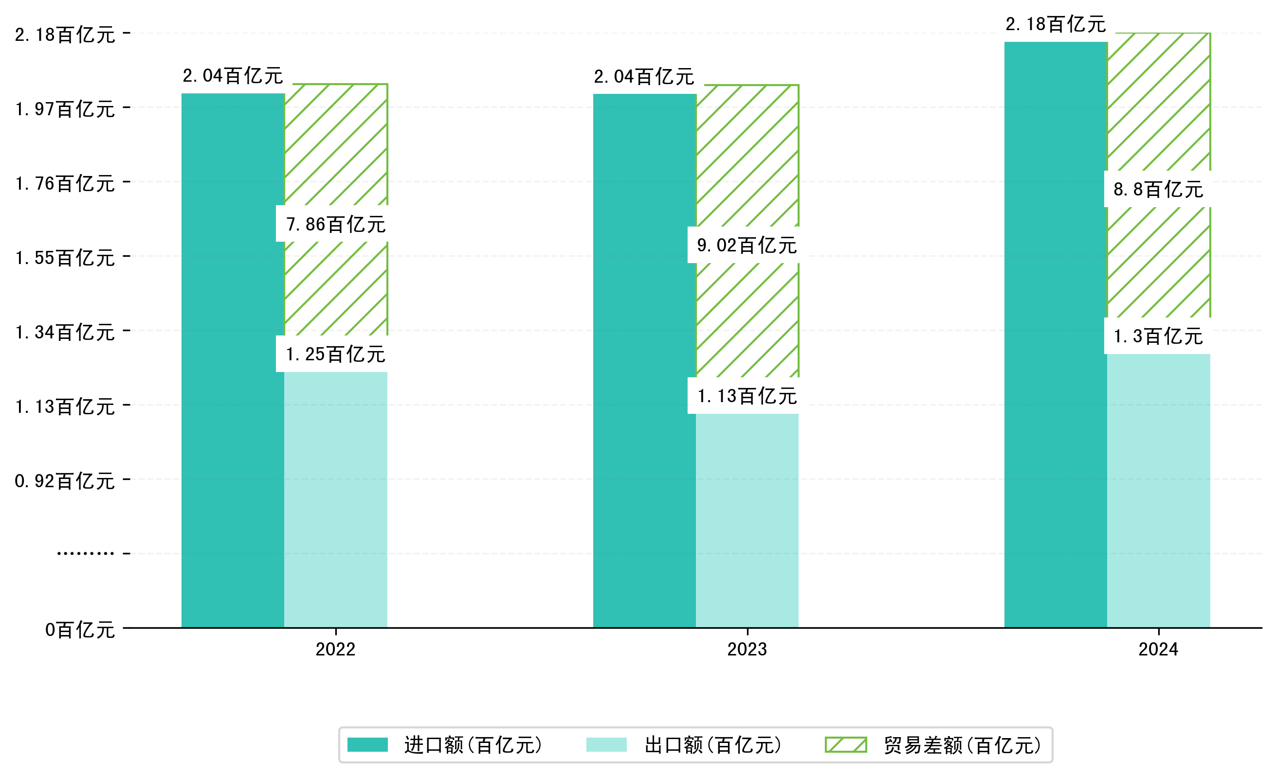 以人民币计,2024年1-3月沈阳市贸易差额为88,0414,6217万元(贸易逆差),相比上年同期增加了2,1841,5976万元,同比增加-2.42%。